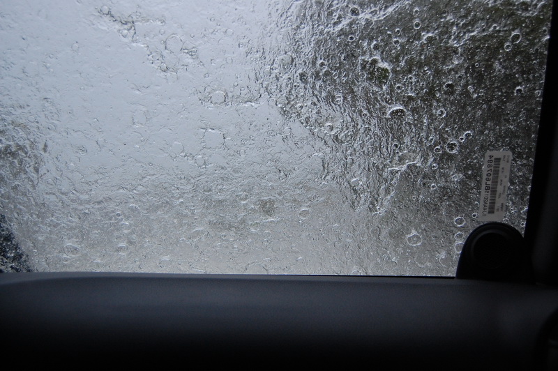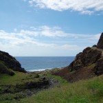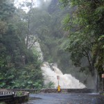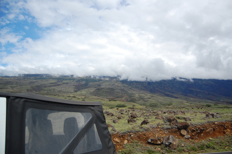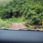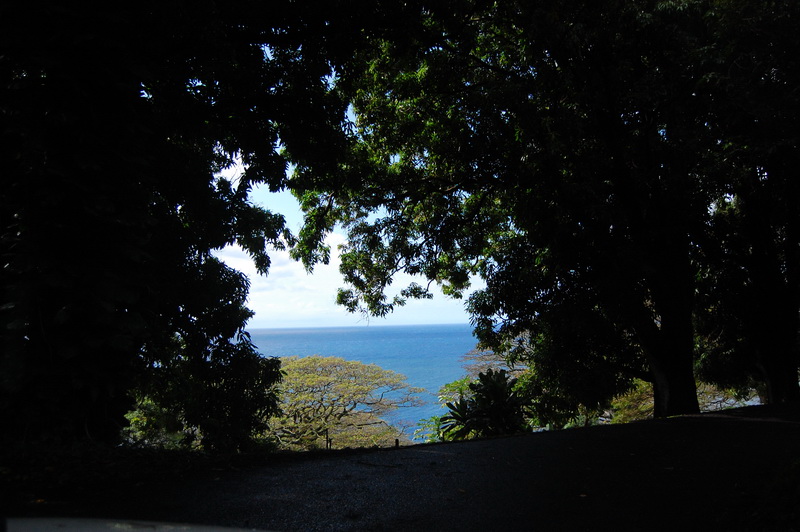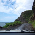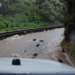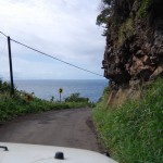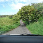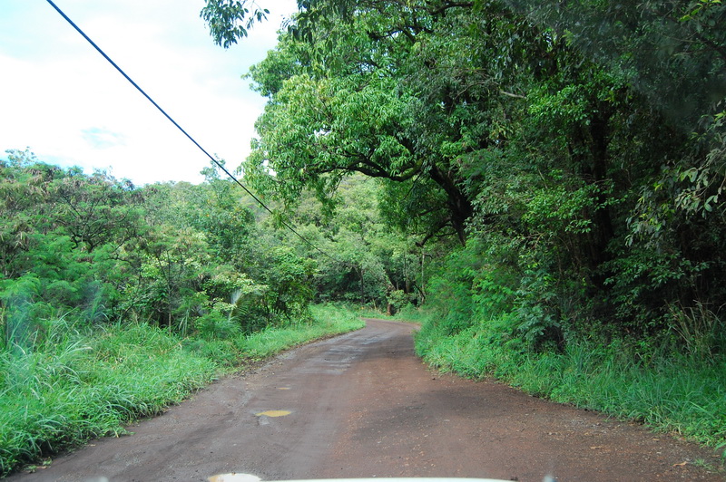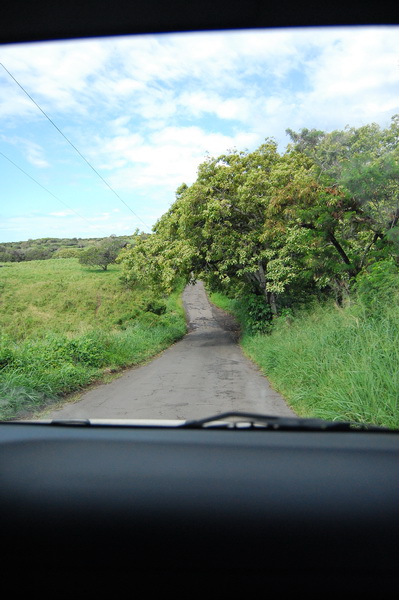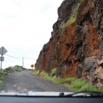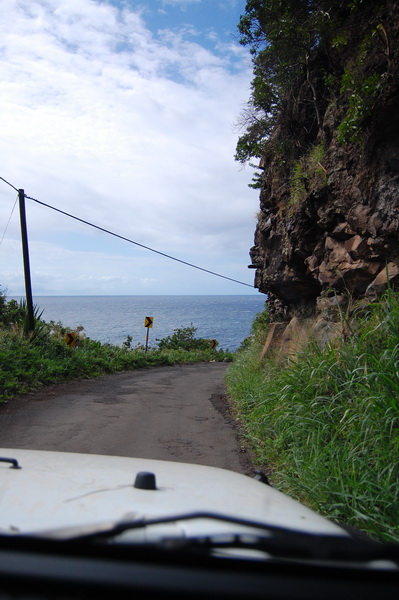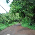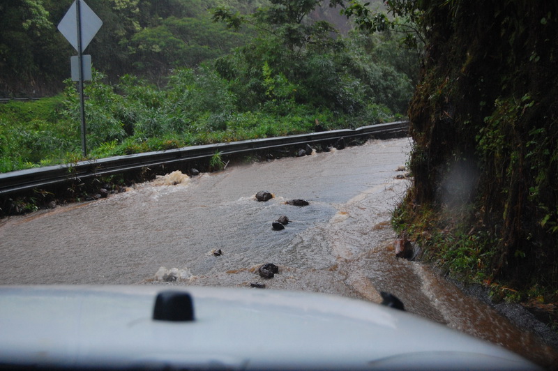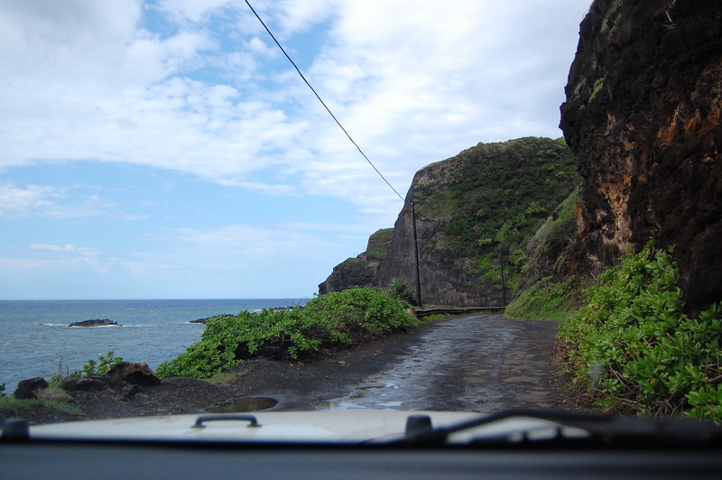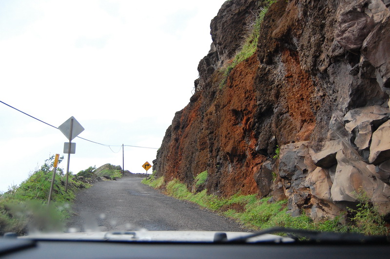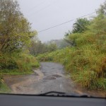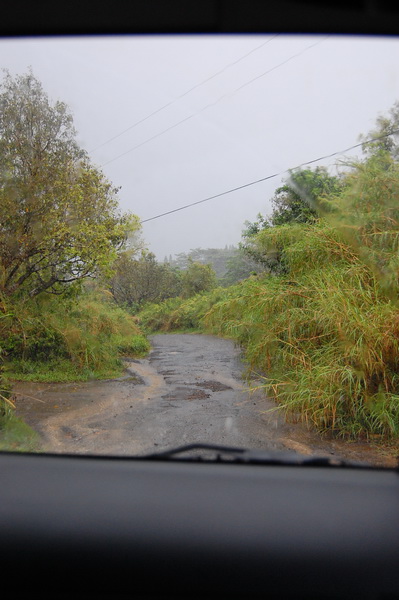 Im stroemenden Regen geht es durch den Regenwald, der seinem Namen nun wirklich alle Ehre macht. Die „Strassen“, sind teils asphaltiert, meist jedoch eine Sammlung von Schlagloechern, die man andernorts wohl nicht mehr benoetigte und kurzerhand hier abgeladen hat und einem roten Trampelpfad aus Vulkangestein und Erde. Ohne 4×4 sieht man bei dem Wetter streckenweise vermutlich einfach recht alt aus, mit dem Wrangler auf 4WD Mode geht es schnurstracks um die Kurven und ueber die Kuppen. Speedlimit 25 mpH … da aber ausser uns eigentlich keine Menschenseele unterwegs ist, gehen wir das Risiko einer behaenderen Fahrweise ein. So macht das dann auch Laune.
