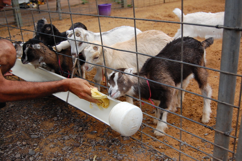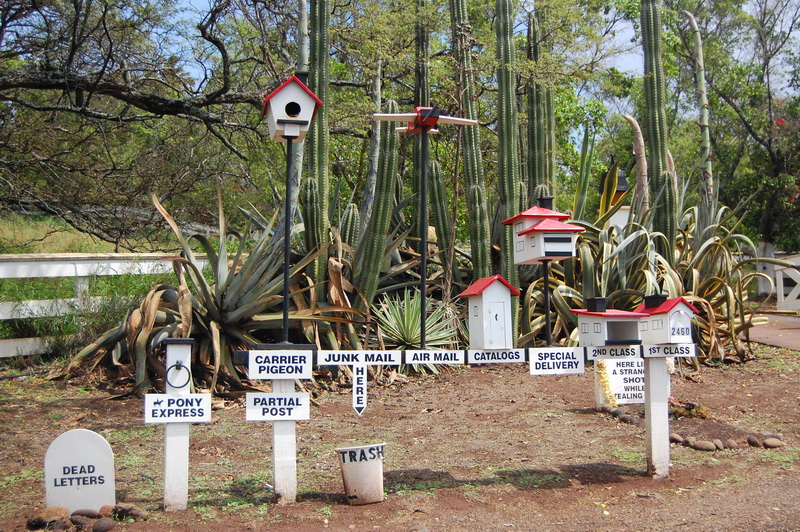 Abstecher zur Surfin Goat Dairy. Ziegenkaese auf Maui. In allerlei leckeren Varianten und dabei 18 Preisgekroente, wird Kaese und Kuchen aus Ziegenmilch fabriziert. Suesse kleine Ziegen, kostenloses Probieren und dann noch einen Ziegenkaesekuchen. Hier ist allerdings wieder Regenwaldfeeling angesagt, das Wetter hat uns eingeholt und da wir keine Milchprodukte in die EU einfuehren koennen und auch keine 500g Ziegenkaese essen wollen, fahren wir weiter. In einem Schiffwetter mit Sichtweite um die 30 Meter geht es ins Dschungelcamp. Dort muss nochmal das Seitenfenster richtig eingesetzt werden, damit auf der anschliessenden Fahrt nach Kahului mit den Laptops nicht die Karre unter Wasser steht.