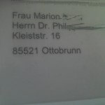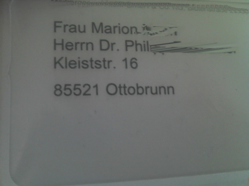 Ich bin ratlos. Termin bloed? Anschreiben dumm formuliert? Falsche Schriftart oder kein chlorfrei gebleichtes Papier? Und dann sehe ich den Schlamassel. Die Weltmeister haben irgendwann mal mitbekommen, einer von den beiden ist auf dem Weg seinen/ihren Doktor zu machen, also knallen wir den mal mit in die Anschrift. Und traditionsbewusst wie man ist, kann das ja nur der Herr des Hauses sein, waehrend Madame sich die Naegel macht und kocht. Die Arme, ich bin fast zusammengebrochen vor Lachen.