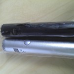 Leider hat die schwarze Tube einen kleinen Defekt, der Plastikkranz am Akkudeckel hat einen Riss von der Seite bis zum Mittelloch ((damit ein kurzgeschlossener Akku ausgasen kann und das Ding nicht zur Rohrbombe wird)).