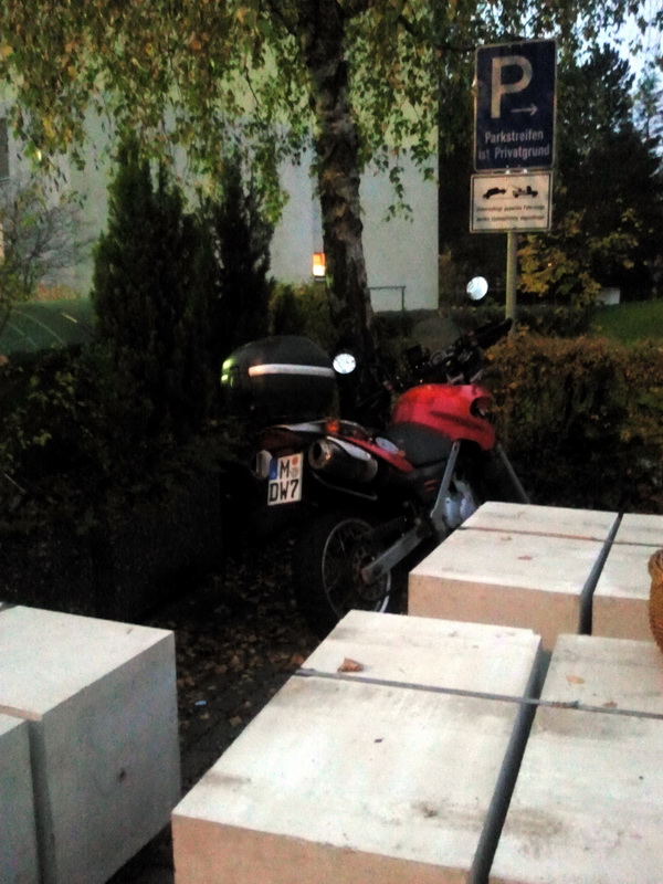 da kommt man Nichts ahnend aus dem Haus und findet die kleine BMW auf dem Parkplatz zwischen allerlei Betonkloetzen. Vor dem Haus wird irgendwas an den Muelltonnenplaetzen gemacht und die Bauarbeiter wussten nicht wohin mit ihrem Kram also wurden leere und „halbleere“ Parkplaetze mit Containern, Erdhaufen, Steinen und eben auch 1 m³ grosse Betonkloetze platziert. Nun benoetigt die F sicher keinen kompletten Parkplatz, stand bis vorgestern auch noch eine KLE500 daneben um den Platz „sinnvoll“ zu nutzen aber dass man mir einfach die Karre mit tonnenschweren Kloetzen zuparkt, das ist schon eine Nummer. Im Moment weiss ich gar nicht recht was ich machen soll, ich brauch die F ja heute und morgen nicht aber danach habe ich frei und wollte die F „Verkaufs-“ oder „Ueberwinterungsfaehig“ machen, je nachdem was eher eintritt. Wenn ein PKW einen einparkt, dann gibt es da ein Kennzeichen und nen Abschlepper. Auf so nem Betonklotz steht nichts. Wegtragen scheidet auch aus und Kran habe ich keinen.