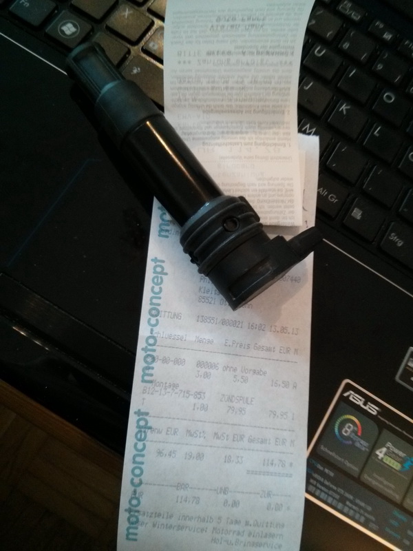 Stecker und Spule sind eine Einheit, die Arbeitswerte waren derer 3 an der Zahl. Da man schnell und ohne lange Suche das Problem lokalisierte und behob, war mir das die Taler mal wert. Und bei den ueblichen Verdaechtigen finde ich gar keine Stecker/Spule fuer die 1200GS und in der Bucht nur Gebraucht ab 38.- EUR. Und gebraucht ((und defekt)) habe ich ja selber.
