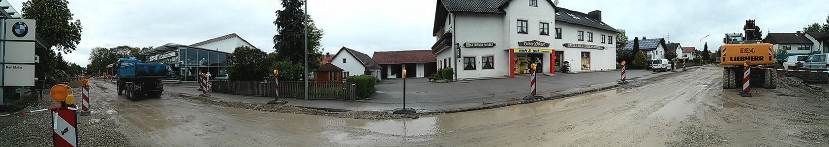 naja, nicht so wirklich. Die Offroadstrecke ist die Ortsdurchfahrt von Neufinsing, an der BMW Karl Maier seine heiligen Hallen hat. Vermittels Baggergeraet und vielen Bauarbeitern schickte sich der Strassenbauer an die komplette Strasse aufzureissen, damit Kanaele und Strassenbelag im Oktober in neuem Glanz erstrahlen und vom Frost zerrissen werden koennen. Diese Baumassnahme fuehrt nun dazu, dass man eine kleine Offroadstrecke direkt vor Maiers Hof, Tankstelle und Gebrauchtmoppedausstellung findet und dankbar am Vortriebsregler dreht.