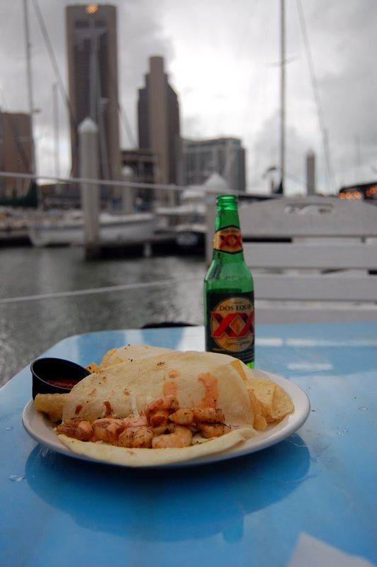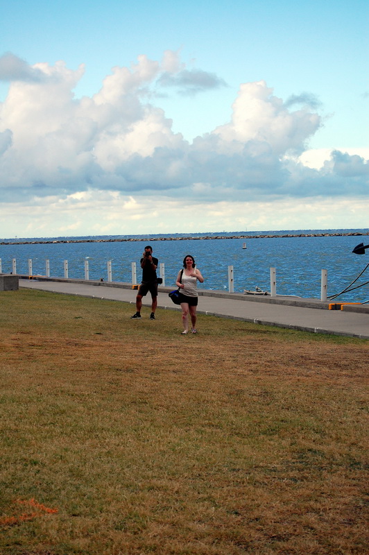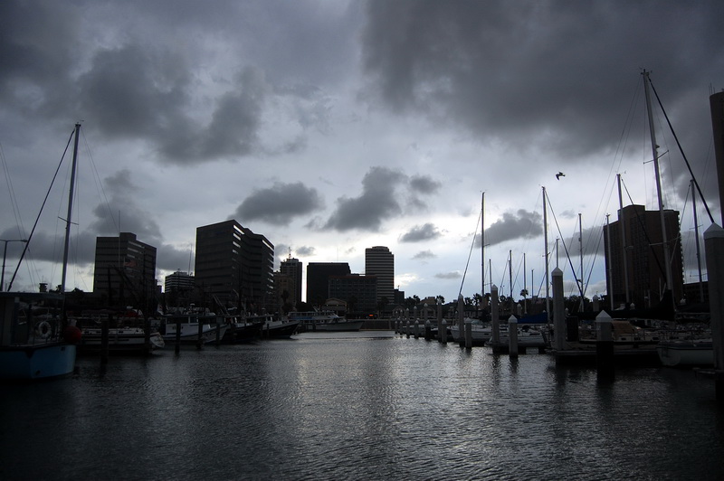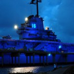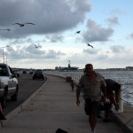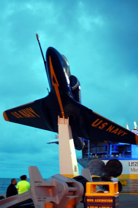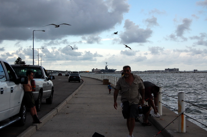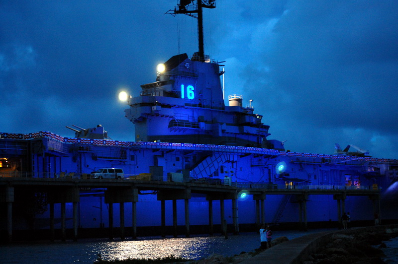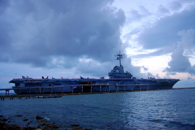 Wir sehen einer Hispanic Grossfamilie beim fischen zu, fotografieren alte Galeonen ((oder sind es Repliken?)) und spaeter den ausgemusterten Flugzeugtraeger USS Lexington, der lila beleuchtet im Hafen als Museum und Attraktion herhalten darf. Nach einem aeusserst schmackhaften Mahl in einem Fischrestaurant an einem der T-Heads ((also T-foermige Ausleger ins Meer, ein Dock)) treffen wir noch Jay Paul der ((wie mittlerweile 80% der Amis)) von ihren deutschen Vorfahren erzaehlt. Ein unglaublich netter Kauz, der uns noch das Versprechen abringt ihm ein Bild von sich per Post zu schicken. Machen wir natuerlich, dauert nur noch ein wenig, sind ja noch auf Tour.