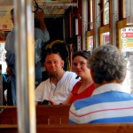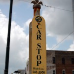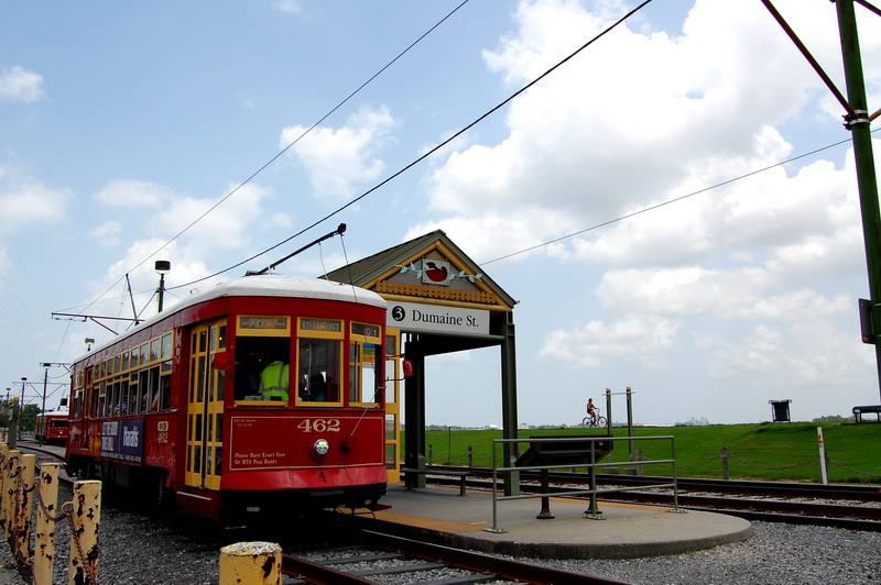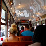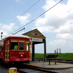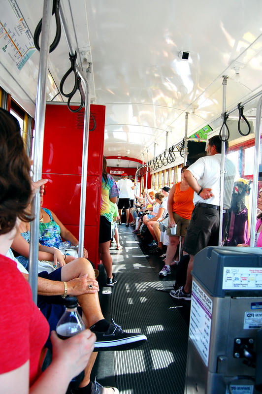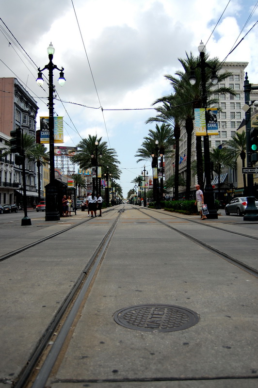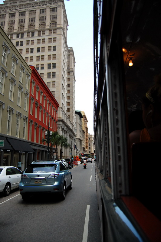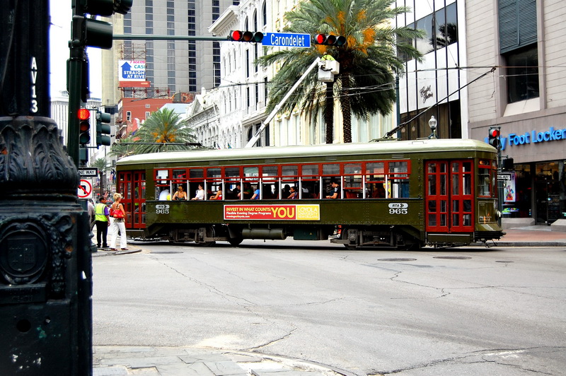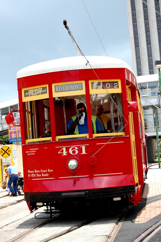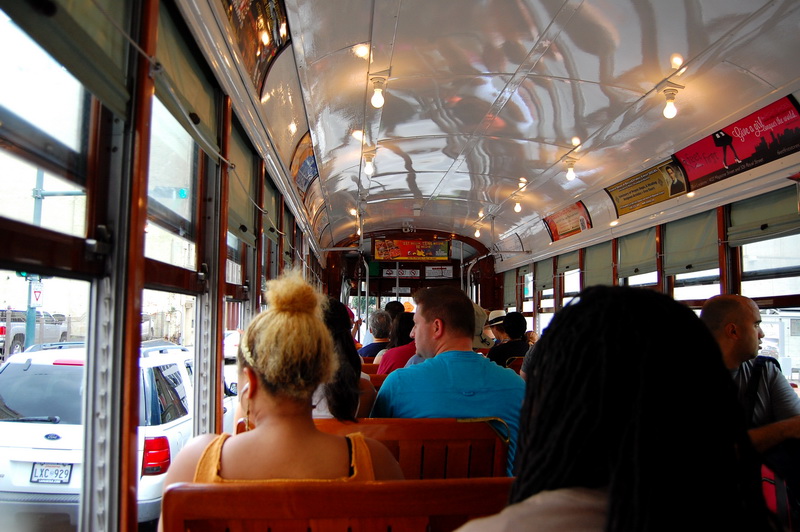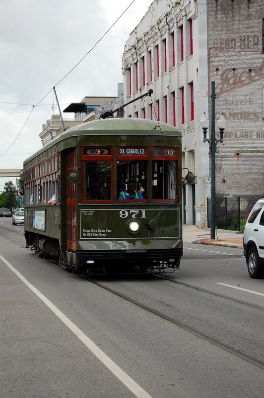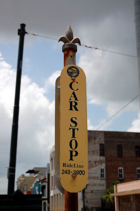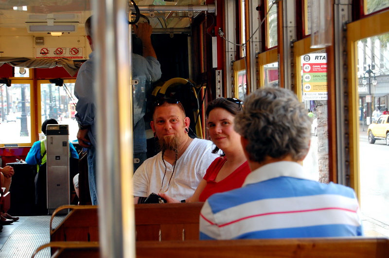 Reine Faulheit und mein Verzicht auf Alkohol bringt uns trotzdem zu dem Schluss, es versuchen zu wollen. Ein Cab kostet einfach 15 USD und parken je nach Oertlichkeit auch. Bei der Heimfahrt also im Plus. Wir kurven also froehlich Richtung Lee Circle und parken dann fuer 8 USD an der Julia St. Genau an der Ecke ist auch eine Haltestelle fuer ein Street Car. Das sind die Pendants zu den Cable Cars in San Francisco und eine tolle Moeglichkeit bequem von A nach B zu kommen. Die Tageskarte fuer alle Linien ((es sind nur 3)) kostet 3 USD gegenueber dem Einzelticket fuer 1.25 USD. Es gibt Street Cars mit Klimaanlagen, meist sind jedoch einfach nur alle Fenster ((inkl. Frontscheiben)) aufgerissen und so blaest eine Brise durch den Wagen. Wir nehmen erst die gruene Linie bis Canal St. dann die Blaue um am Riverwalk bis zum French Market zu kommen.