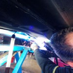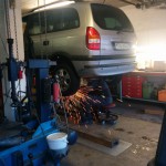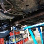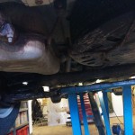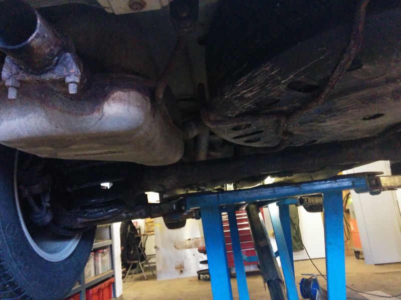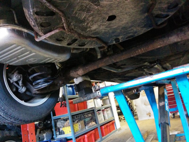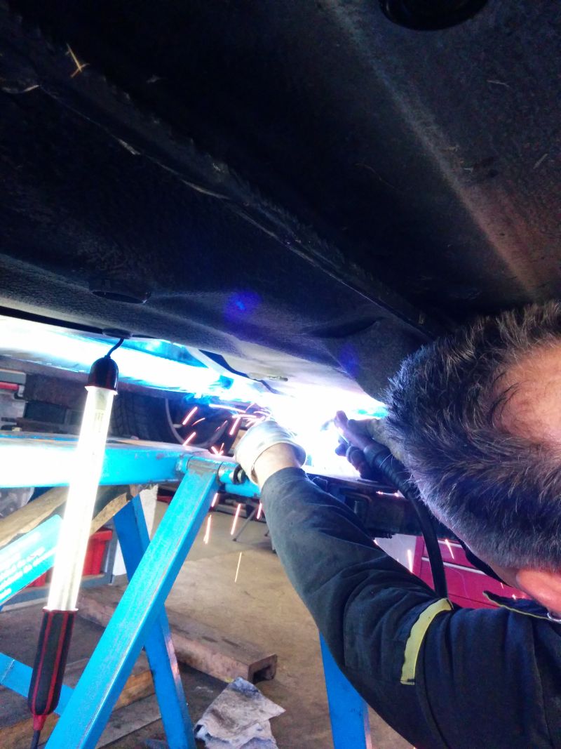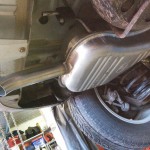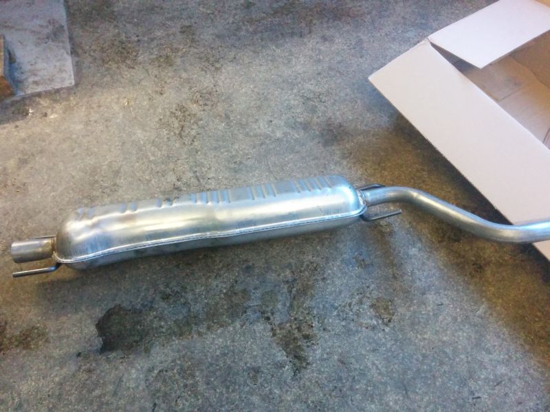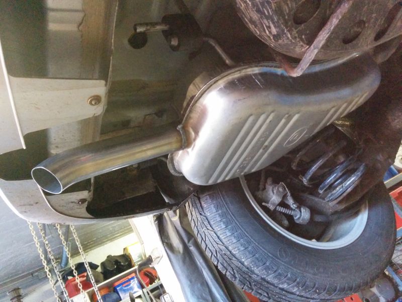 Da der Vorbesitzer, respektive der Bastelverein der dafuer Zustaendig war, hatte um die allerorten vorhanden Loecher zu flicken, reichlich Schweissnaht, Auspuffzement und GunGum den Goettern des Rosts geopfert und damit die Sache eher verschlimmbessert. Der alte Pott wurde also abgeflext, ein neues Rohrstueck angeschweisst und an dieses kann man nun den neuen Mittelschalldaempfer ganz normal anflanschen. Sieht also wieder aus, wie ab Werk. Weniger ab Werk ist dieses ulkige Loch an der Heckschuerze, die der Vorbesitzer ausschnitt ((vermutlich mit der Bastelschere)) um eine alberne Auspuffblende anzubringen. Die ist sowieso nach wenigen Kilometern schon verlustig gegangen. Haette ich sie vorher nicht mal gesehen, ich wuerde noch immer raetseln, was das Loch soll. Sieht man aber zum Glueck von hinten eh nicht.