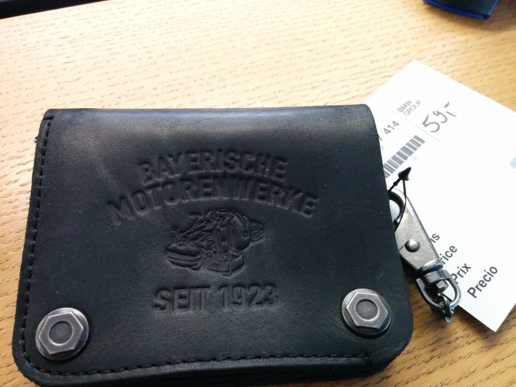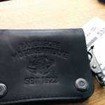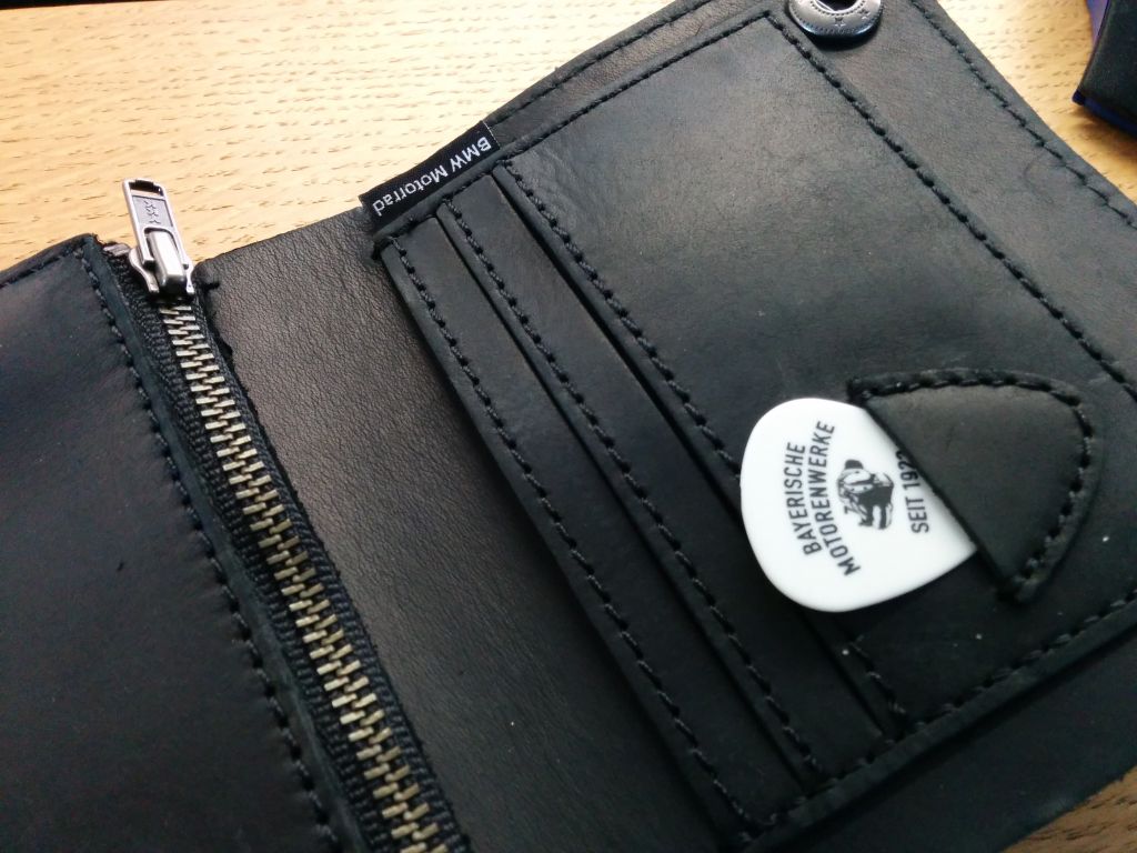 … waere ein stilvoller Anfang fuer eine Alliteration im Stile von „Dorfdepp sucht Bueckstueck Magd“. Jedenfalls war dies einer der ersten Gedanken bei den kuerzlich vorgefundenen BMW Devotionalien fuer den aelteren Rocker auf Trachtensafari. Ledergeldbeutel mit Kette, beides in sanftem Fruehlingsschwarz gehalten. Die Pseudomuttern waren noch ein pfiffiges AddOn im die selbe Boerse gleich noch bei HeinzGerippe oder TanteLouise feilbieten zu koennen, vollends von den Socken war ich jedoch beim mitgelieferten Plektrum.