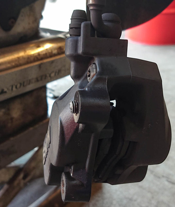 Das Ausbauen der Räder und das statische Wuchten nach dem Wechsel der Pelle ist ja gar nicht das Ding, nur müssen vorne die Bremssättel ab. Vier 8er Schrauben, 10.9er mit zaghaften 30 Nm angezogen halten die Sättel am Gleitrohr. Leider riss die obere Schraube des rechten Sattels mit einem leisen Knack ab und davor sitzend staunte man nicht schlecht über den Zustand, der nun eingetreten war.