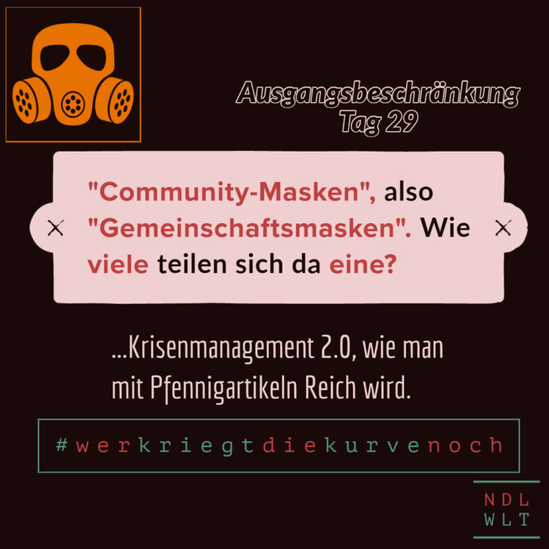 Ausgangsbeschränkung Tag 29 18. April 2020 phil Allgemein, political incorrect Kommentar hinterlassen
