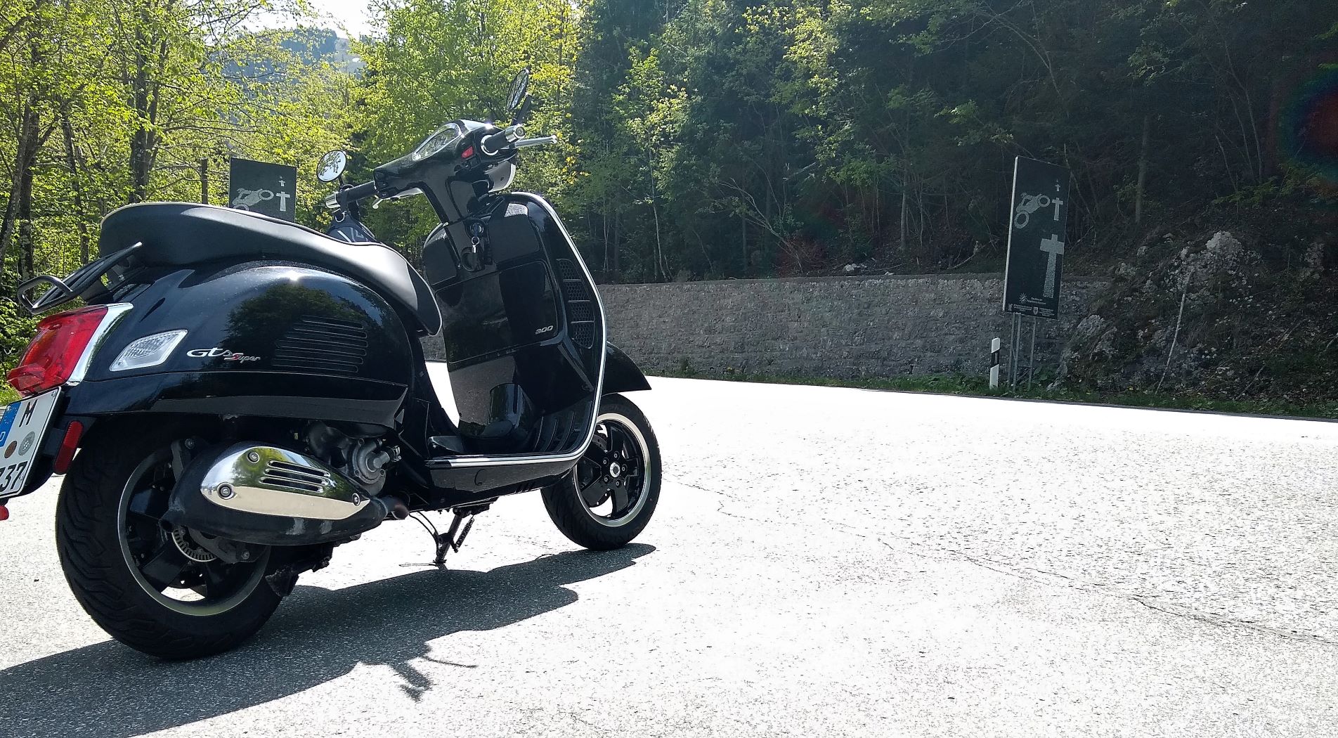 Mit 24 PS und 300 cccm wuchtet die kleine GTS die 120 kg Zuladung am Ende trotzdem ordentlich den Berg rauf und runter. Beim ersten Aufstieg klappte mir erstmal die Kinnlade ein Stück runter, irgendwie hatte ich das flotter in Erinnerung. Den Roller vernünftig auf die Anhöhe zu treiben ist also etwas „anspruchsvoller“, wenn man nicht die gewohnten 100 PS aus 1200 ccm Hubraum unterm Arsch hat. Auch das Integral ABS mit Bremskaftverstärker fehlt in der kleinen Italienerin, also deutlich kraftvoller reinpacken, damit sich da was rührt und man nicht nur die Bremse heiss fahren will.
