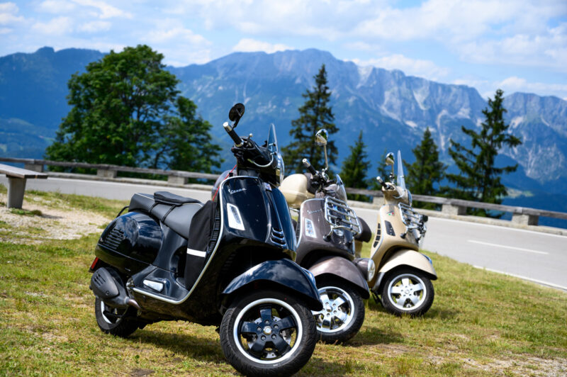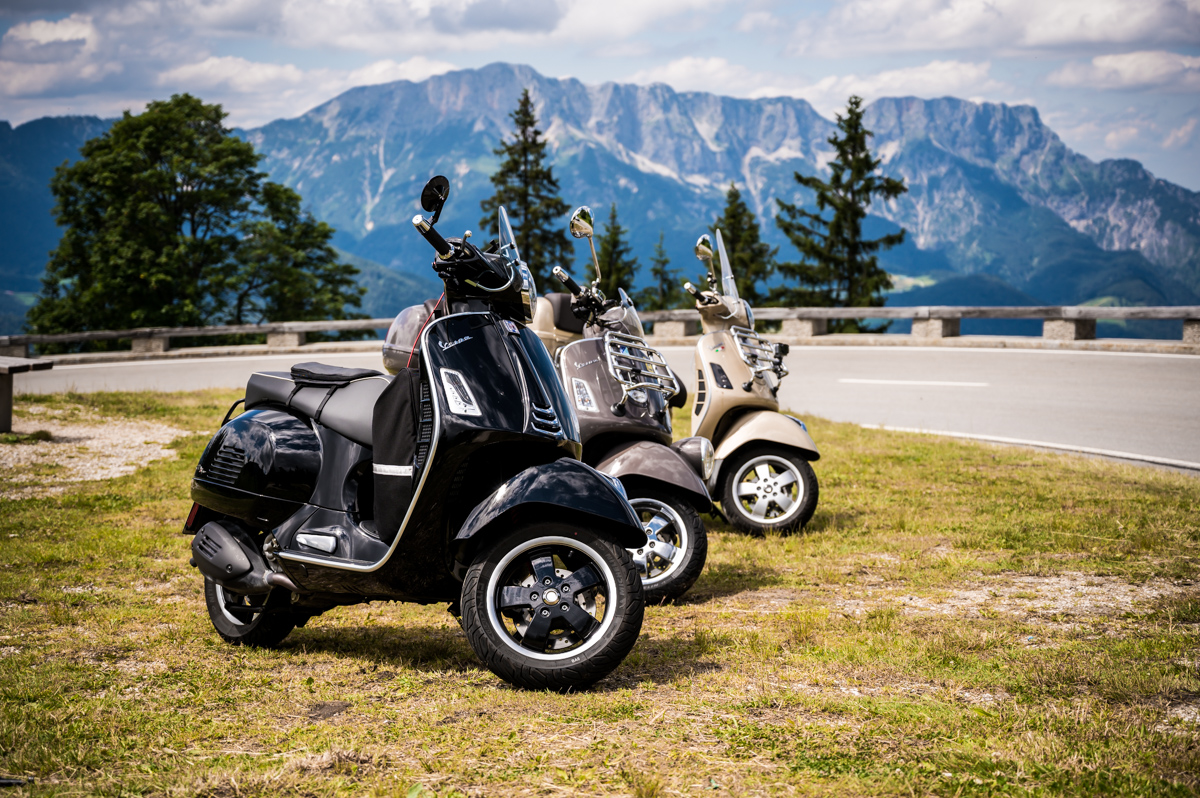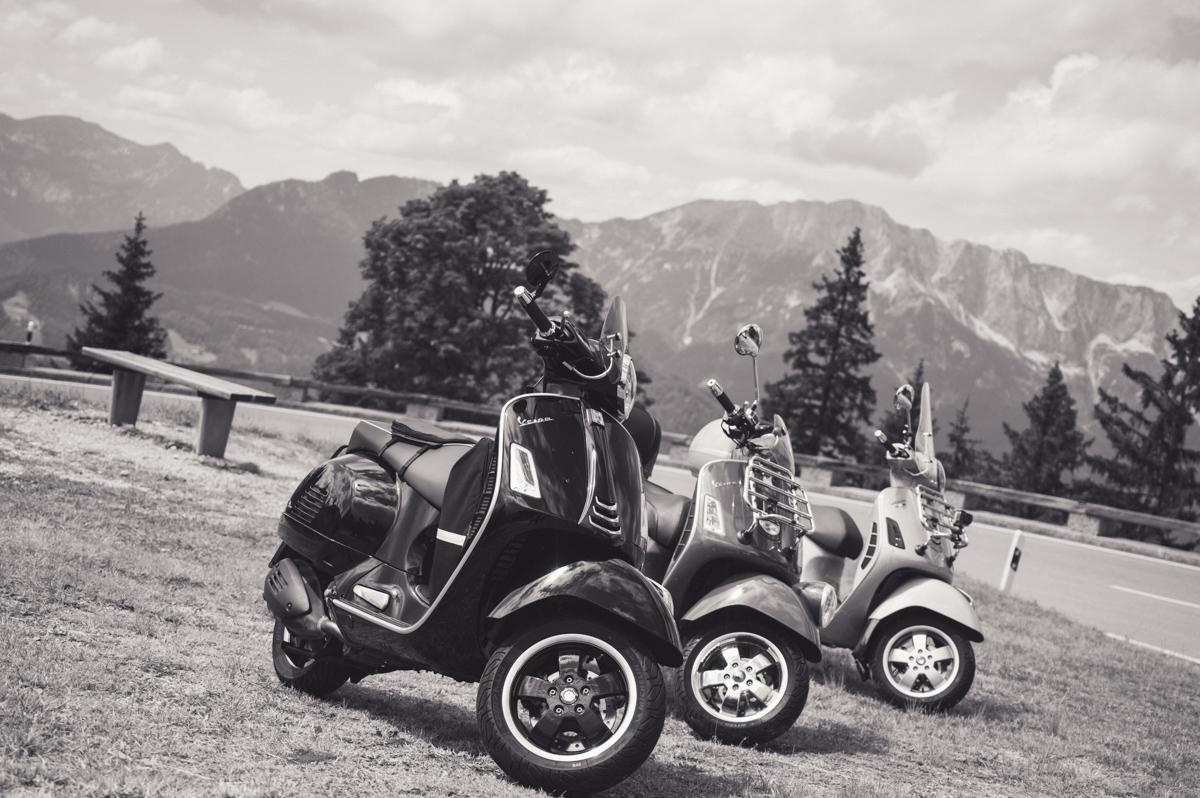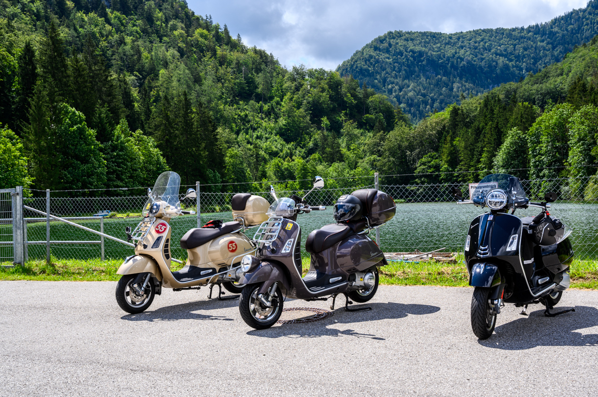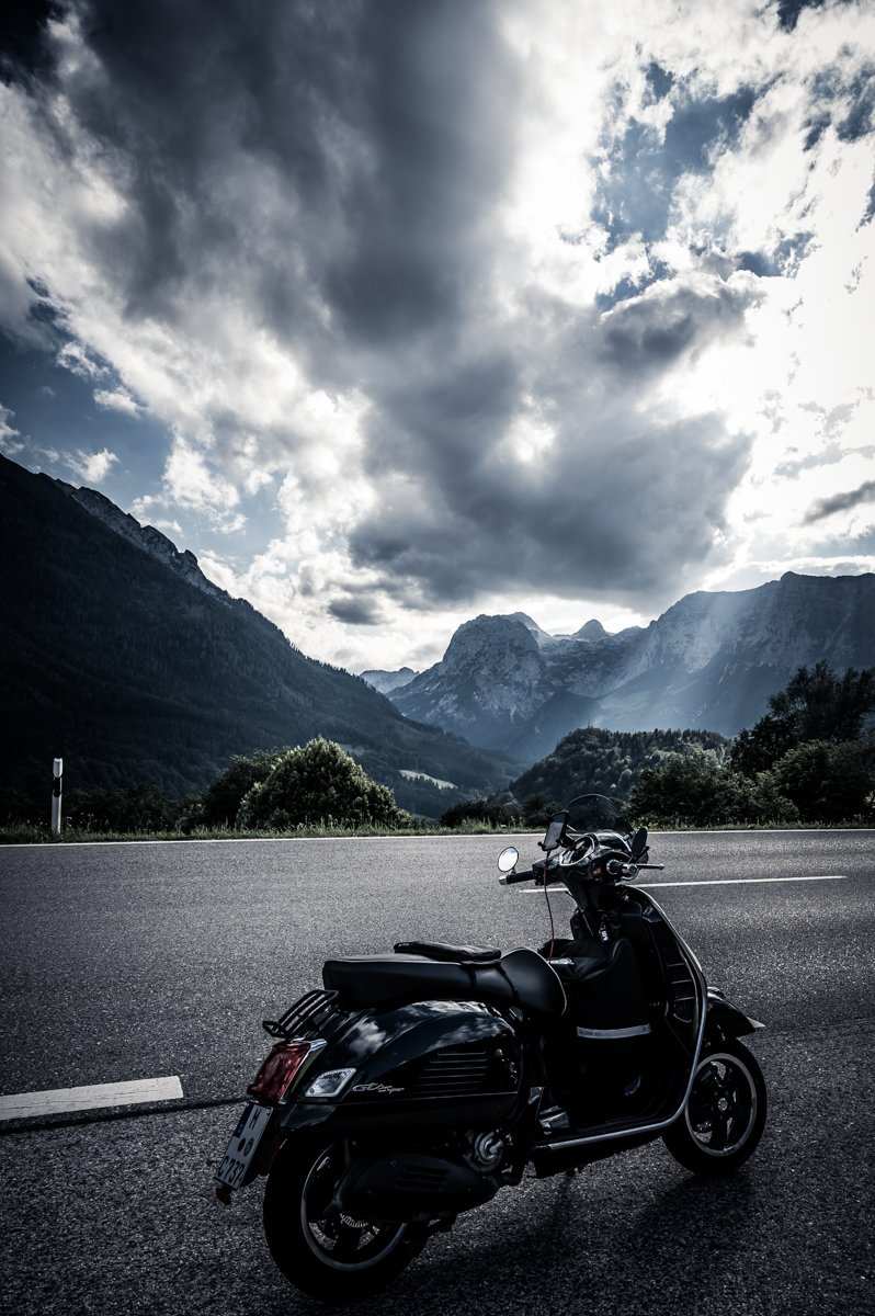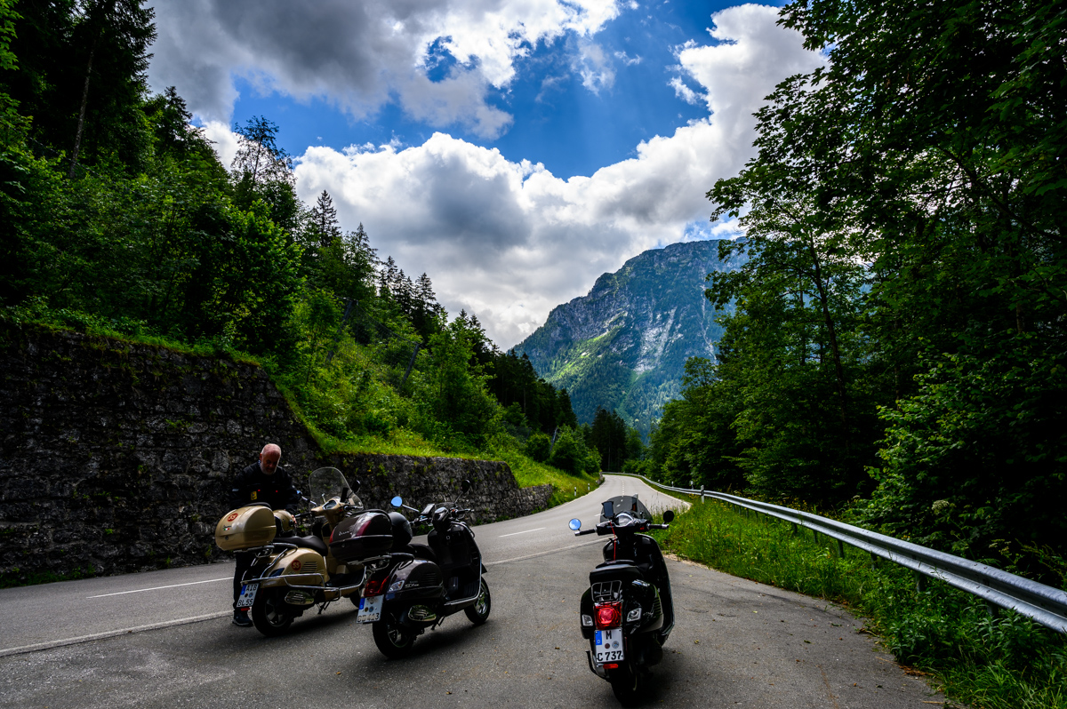 An einem flauschigen Sonntag, bei beinahe strahlend blauem Himmel, habe ich mich an eine Rollerausfahrt geklemmt, die ansonsten aus nur noch 2 von geplanten 6 Rollatoren bestanden hätte. Also nix wie hin an den Treffpunkt Chiemsee und ab Richtung Königssee, von dem ich übrigens genau nix gesehen habe.