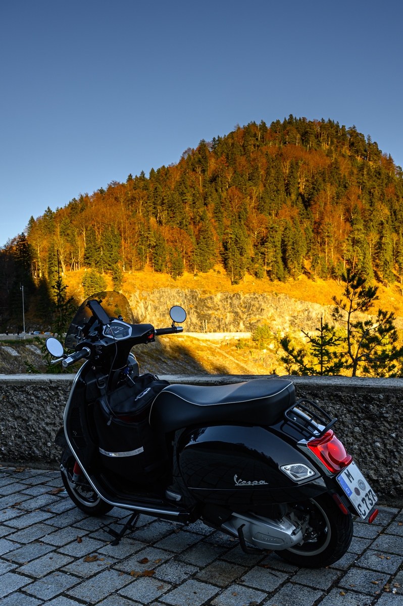 Inzwischen ist es ja auch wieder die Jahreszeit, in der ein Arbeitstag im Dunklen beginnt und auch endet. Tageslicht gibt’s durch’s Fenster. Strahlendblauer Himmel konnte jedoch ausnahmsweise spontan motivieren und so schwung … schwong .. schwang $Mensch seinen Astralleib auf die italienische Ziege und ab geht’s Richtung „Berge“.