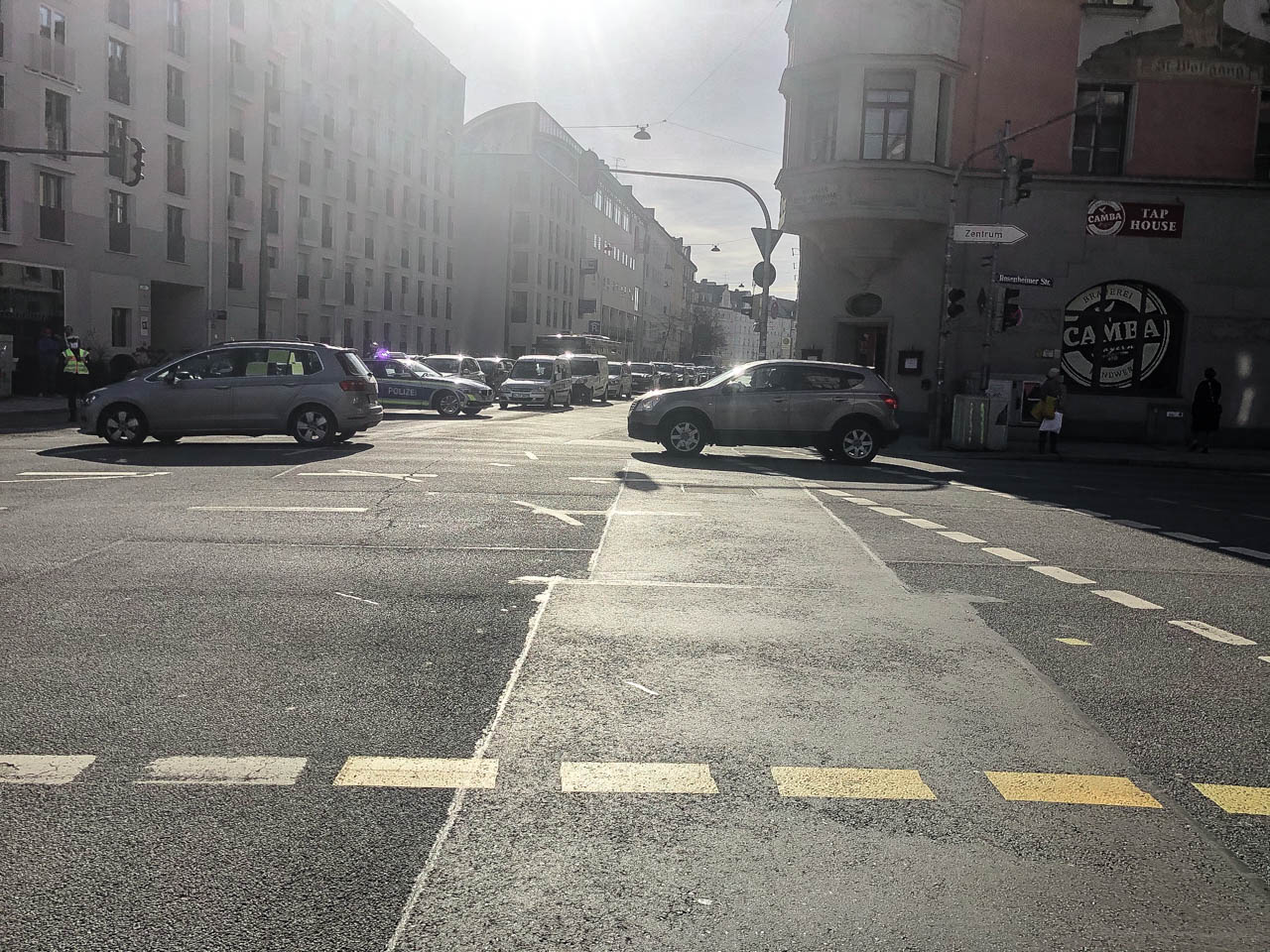 Die Idee, statt mit dem Rollator in Richtung Berge zu kradeln, einfach mal die nächste Grossstadt zu durchqueren, ist eine leidlich doofe Idee an einem sonnigen Samstag Mittag. Nicht der Samstag an sich oder die Tatsache, dass es schmucke 15°C mit Sonnenschein hatte, mehr das klitzekleine Problem, dass halt gefühlt jeder diese Idee hatte. Also nicht zwingend mit dem Krad aber eben durch München zu fahren, per Auto, Mopped, Roller, Mofa, Radl und Millionen und Milliarden zu Fuss.