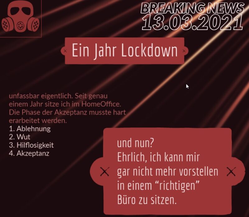 Diese damals (TM) noch sehr übertrieben wirkende Massnahme nahmen wir dennoch dankend an. Gleichwohl wir das Ausmass und die Tragweite dank der Meldungen aus der ganzen Welt, die wir auf einem grossen Monitor mit wachsender Besorgnis verfolgten, war HomeOffice für Alle ein radikaler Schritt.
