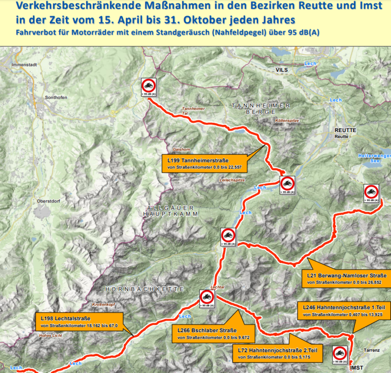 Aufgrund der erheblichen Lärmbelastung für die im Bezirk Reutte lebende Bevölkerung werden ab dem Jahr 2021 jeweils vom 15. April bis 31. Oktober eines jeden Jahres, Fahrverbote für besonders laute Motorräder Standgeräusch (Nahfeldpegel) > 95 dB (A) erlassen….