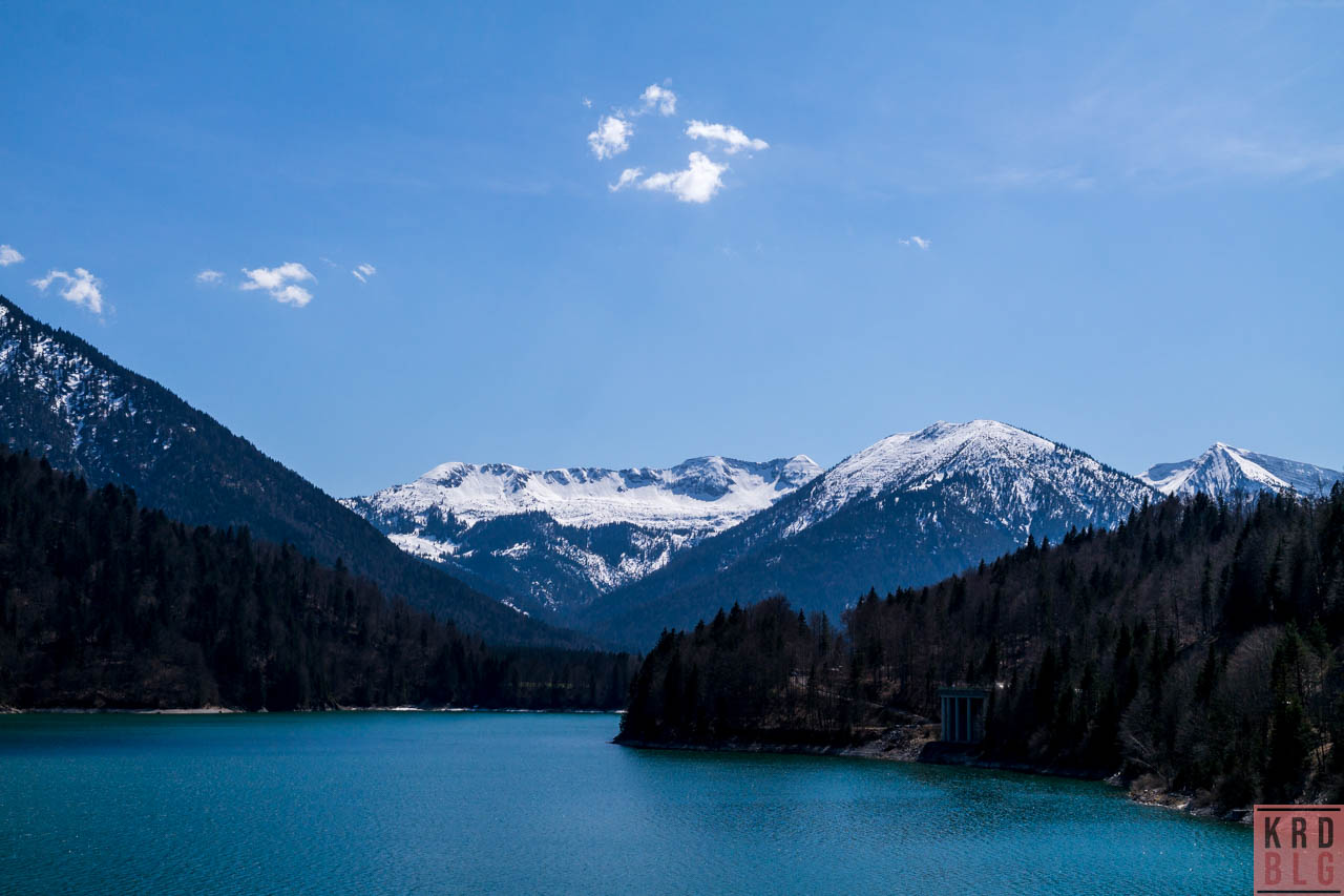 Vom Damm aus ging es dann über die Mautstrasse von Vorderriss nach Wallgau und weiter am Walchensee entlang nach Kochel, wo die Rennleitung wieder mal fleissig Kradisten rauswinkte. Gibt ja nix wichtigeres im Moment ..