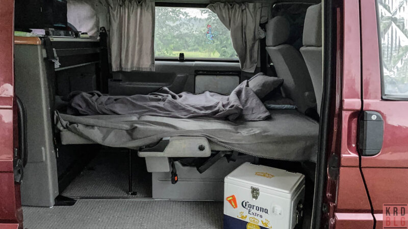 Obwohl die 2.70m hohe Fuhre ein ausklappbares Bett im Dach hat, zog ich es vor die untere Bank umzuklappen und dort zu nächtigen. Permanente Stehhöhe geht vor „einfachen Bettenbau“.
