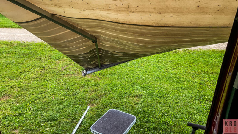 Den nächtlichen Starkregen hat nun auch der zweite Fuss der Markise mit dem Leben bezahlt, jedoch war der Zustand der Markise im günstigen Kaufpreis bereits berücksichtigt, also kein Drama.