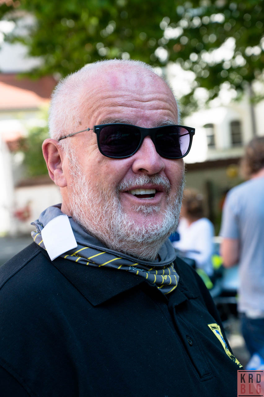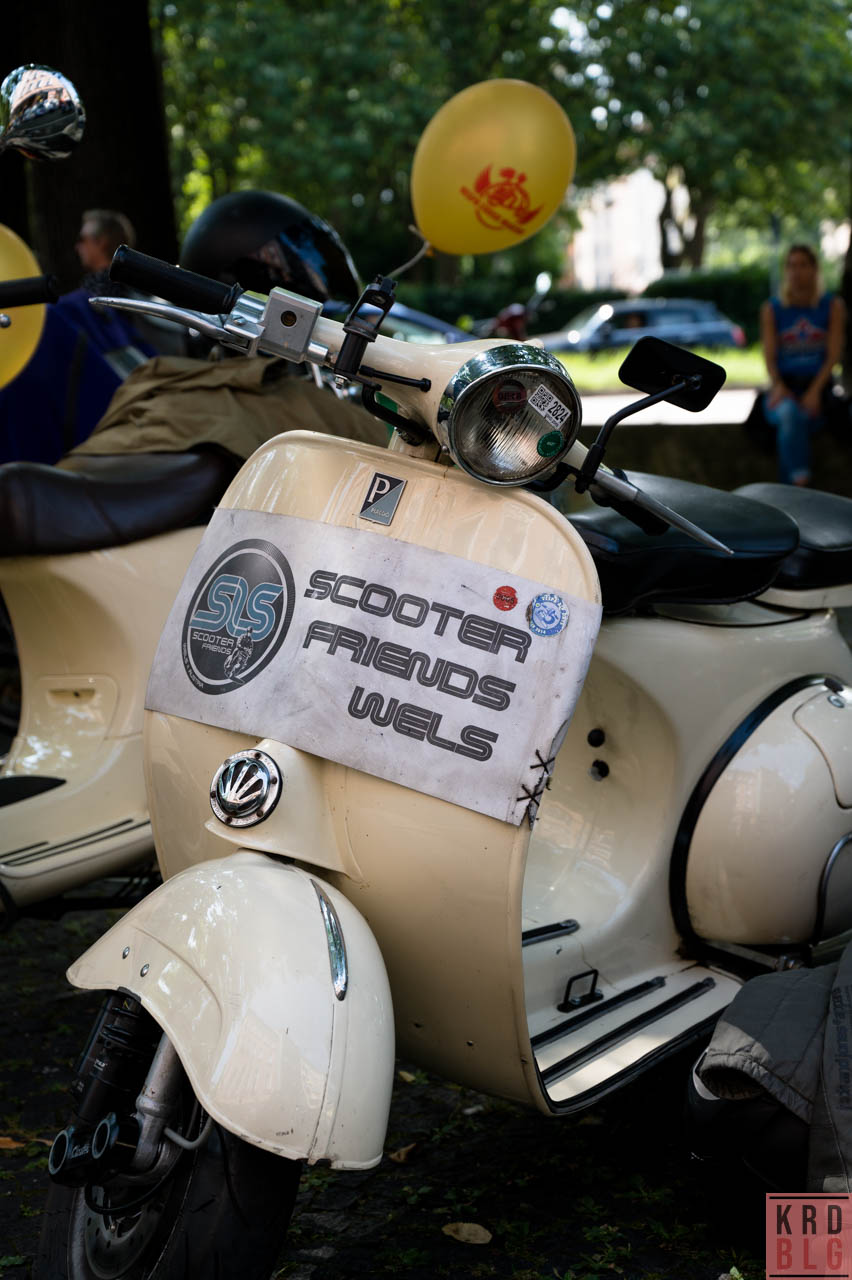 31°C, kein Ausschank .. war klar aber ich bring das nächste mal ein Privatfass Hopfentee mit 😉 Nach der Registrierung ab 11:00h folgte gegen 12:00h noch die obligatorische Ansprache (kein Religionsgedusel mit „segne unsere Rennkrapfen“ und so) und der Dank an die Vespa Clubs München und ein Grusswort an die Veranstalter der Alp Days in Zell am See (Nicole und Franz Schmalzl), die es sich nicht nehmen liessen, mit im Corso zu fahren.