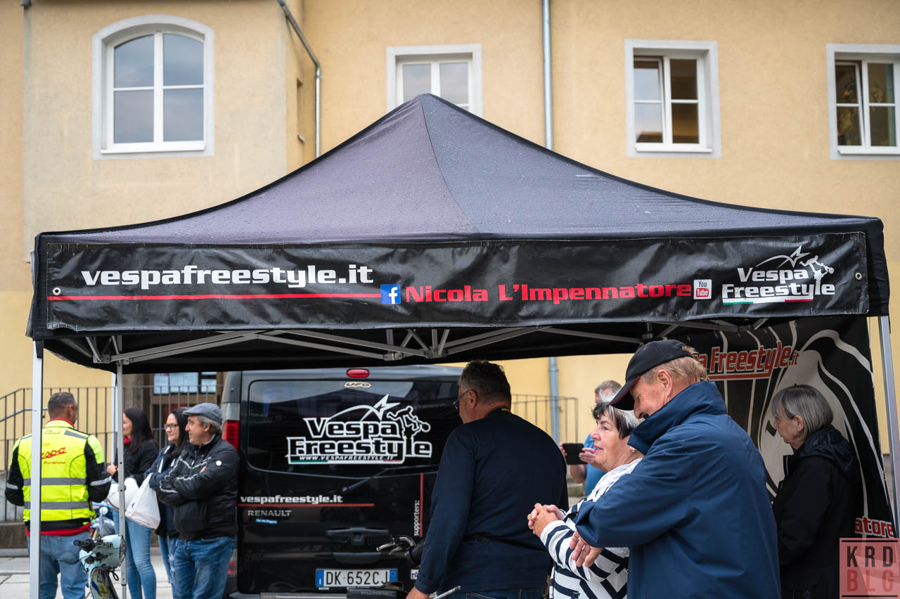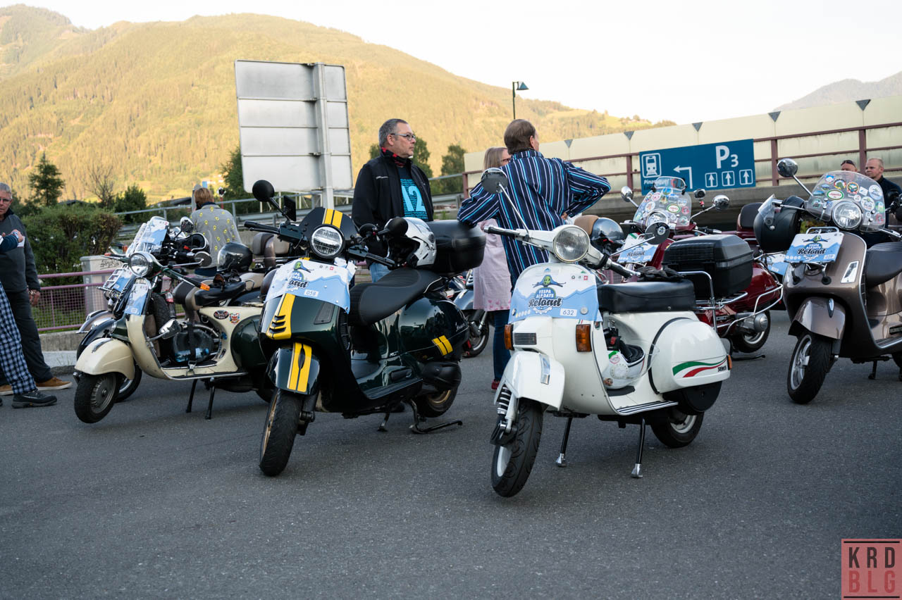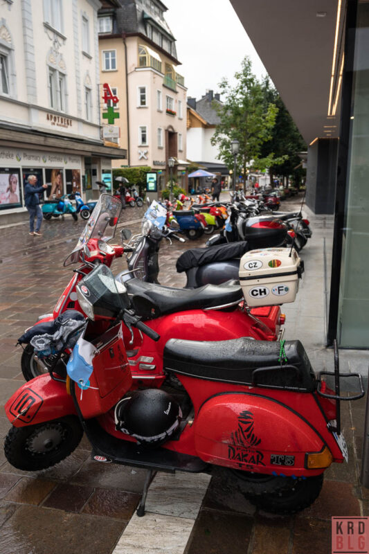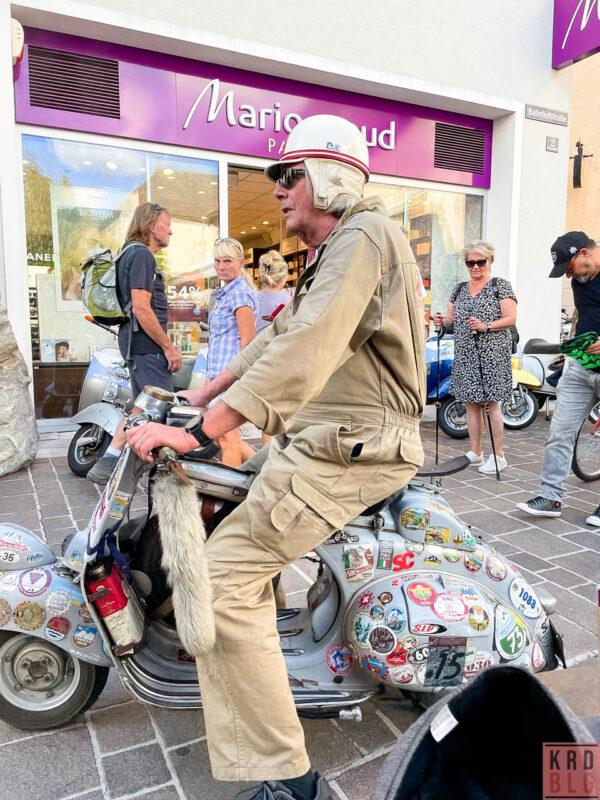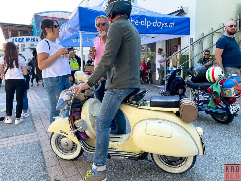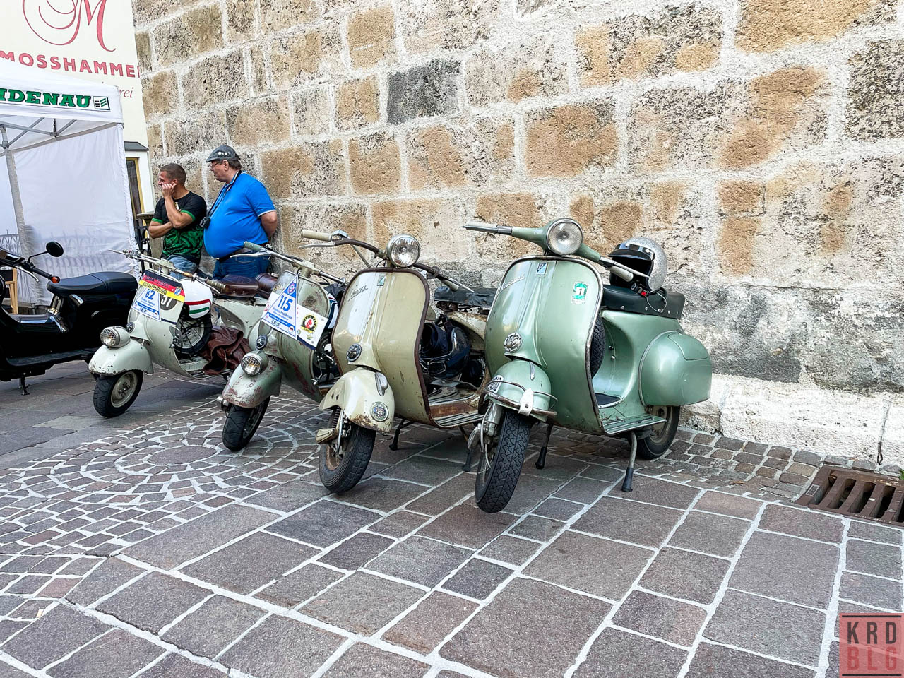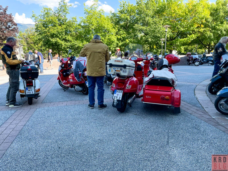 Zieht man also diverse Maut, das T-Shirt, Sticker, Plaketten, Schildbanner und Co aus dem Begrüssungspaket ab, relativiert sich das Nenngeld wieder und bietet dem, der es mag, einen netten Gegenwert. Nach dem Check-In, bei dem man sein Begrüssungssackerl erhält, bekommt man auch das Schildbanner für die Vespa, mit der man während der Veranstaltung direkt in die Fussgängerzone einfahren kann. So muss man nicht umständlich irgendwo einen Platz suchen sondern stellt seine Karre einfach neben das Eiscafe und hat Helm, Jacke, etc. im Blick (nicht dass das notwendig wäre) und kann so von Cafe zu Kneipe und weiter ins Restaurant rollern und hat seinen Kram immer dabei. Eine sehr praktische Regelung.