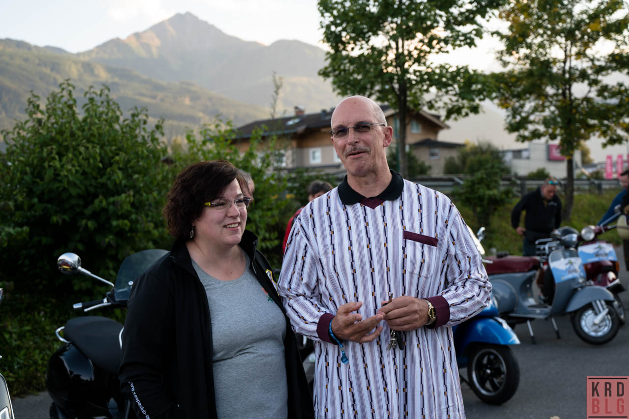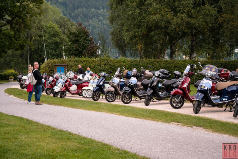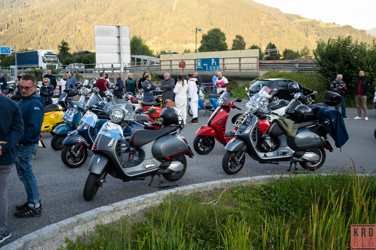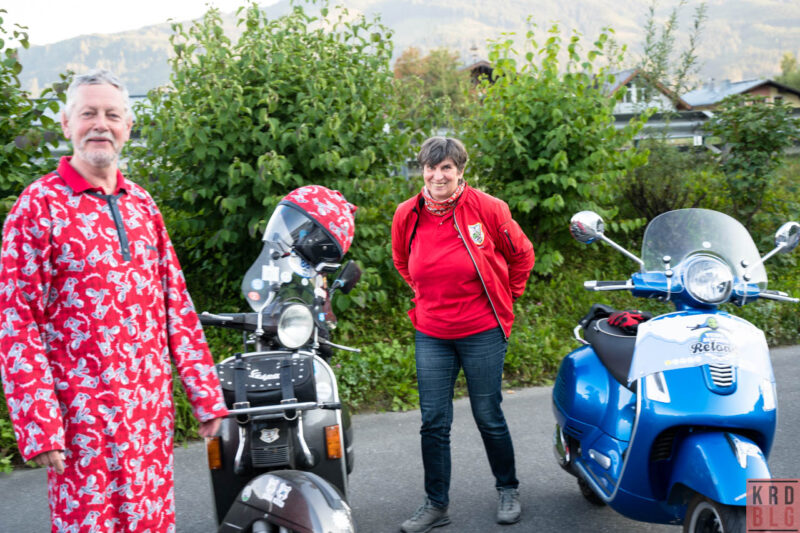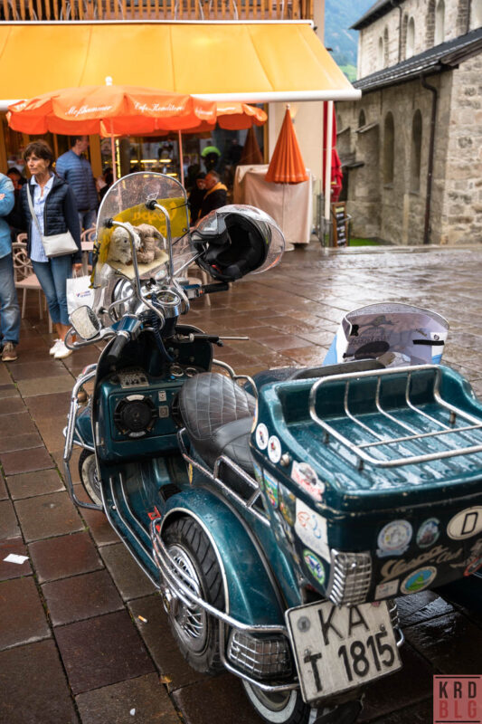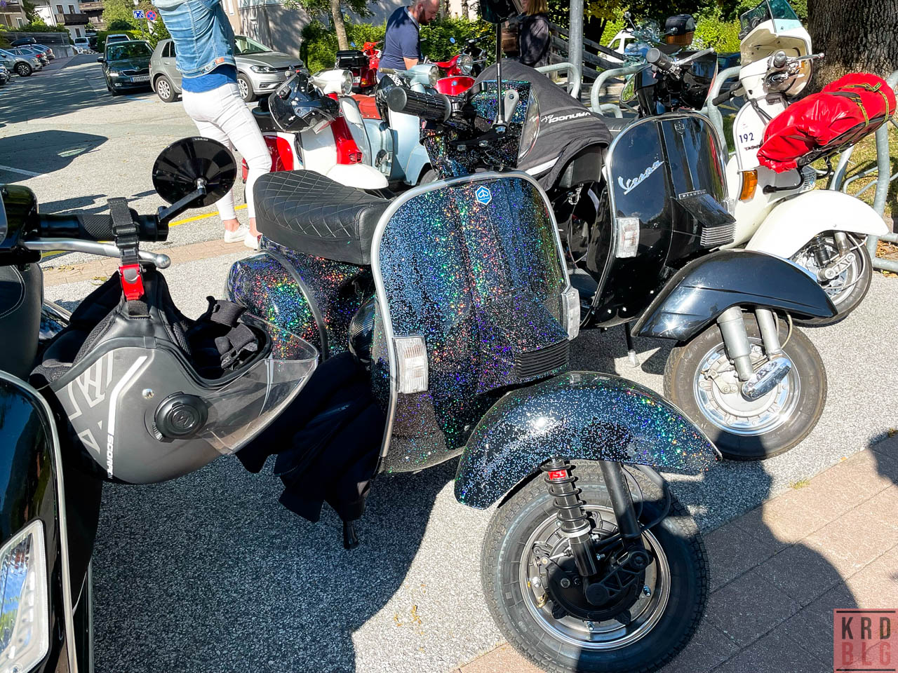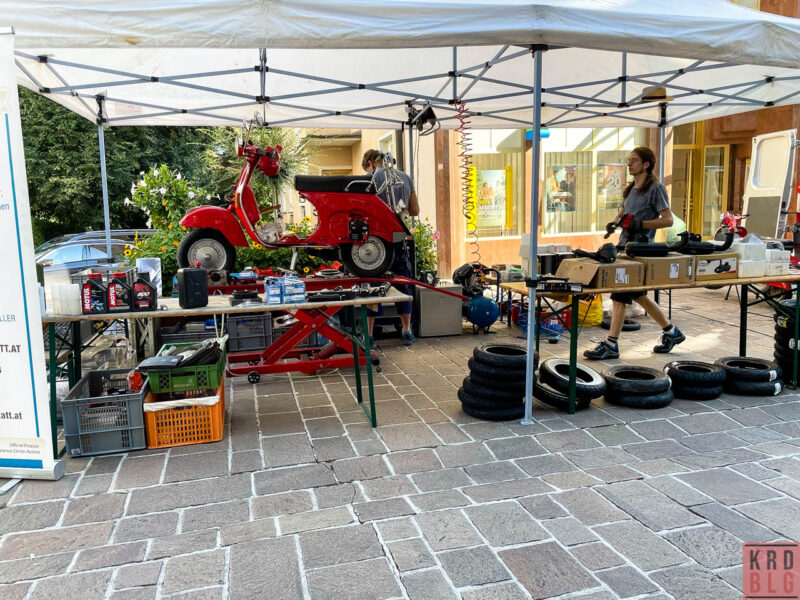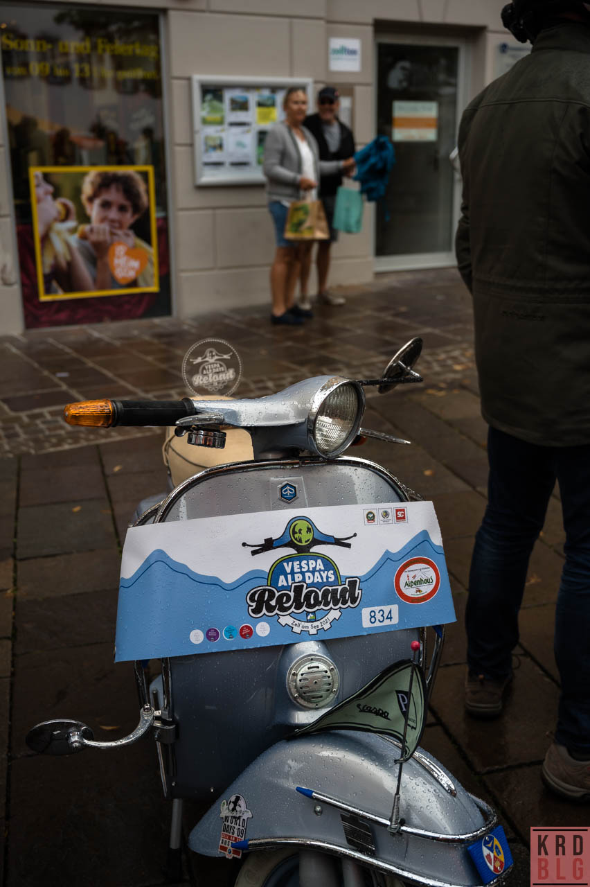 Zieht man also diverse Maut, das T-Shirt, Sticker, Plaketten, Schildbanner und Co aus dem Begrüssungspaket ab, relativiert sich das Nenngeld wieder und bietet dem, der es mag, einen netten Gegenwert. Nach dem Check-In, bei dem man sein Begrüssungssackerl erhält, bekommt man auch das Schildbanner für die Vespa, mit der man während der Veranstaltung direkt in die Fussgängerzone einfahren kann. So muss man nicht umständlich irgendwo einen Platz suchen sondern stellt seine Karre einfach neben das Eiscafe und hat Helm, Jacke, etc. im Blick (nicht dass das notwendig wäre) und kann so von Cafe zu Kneipe und weiter ins Restaurant rollern und hat seinen Kram immer dabei. Eine sehr praktische Regelung.