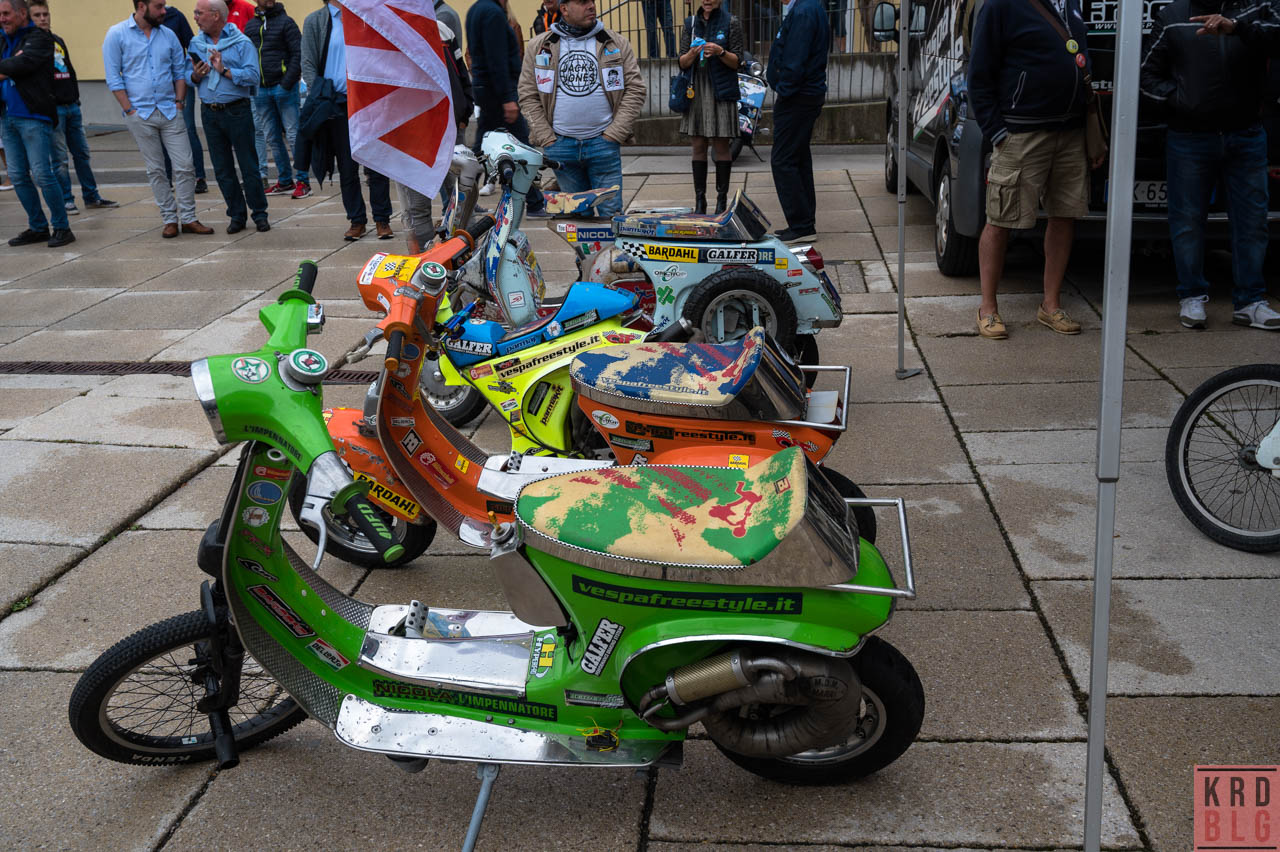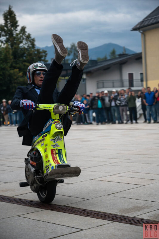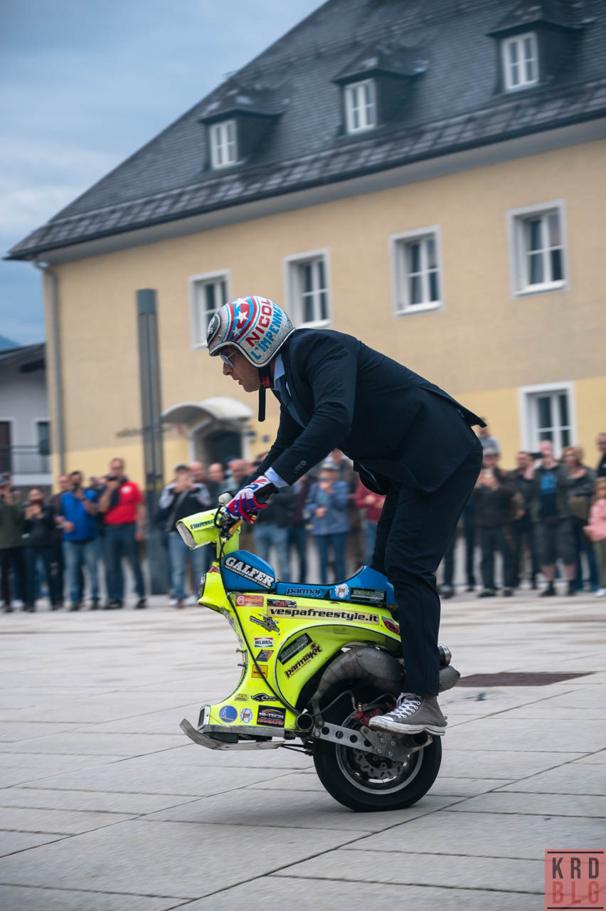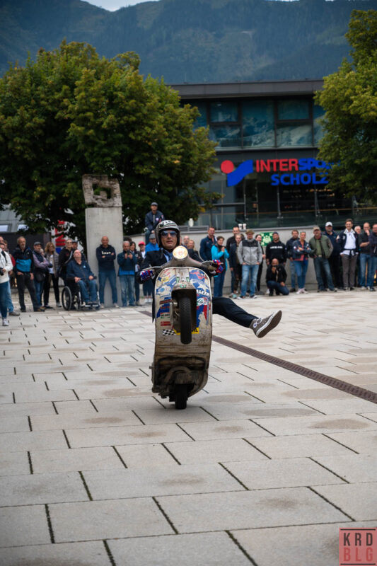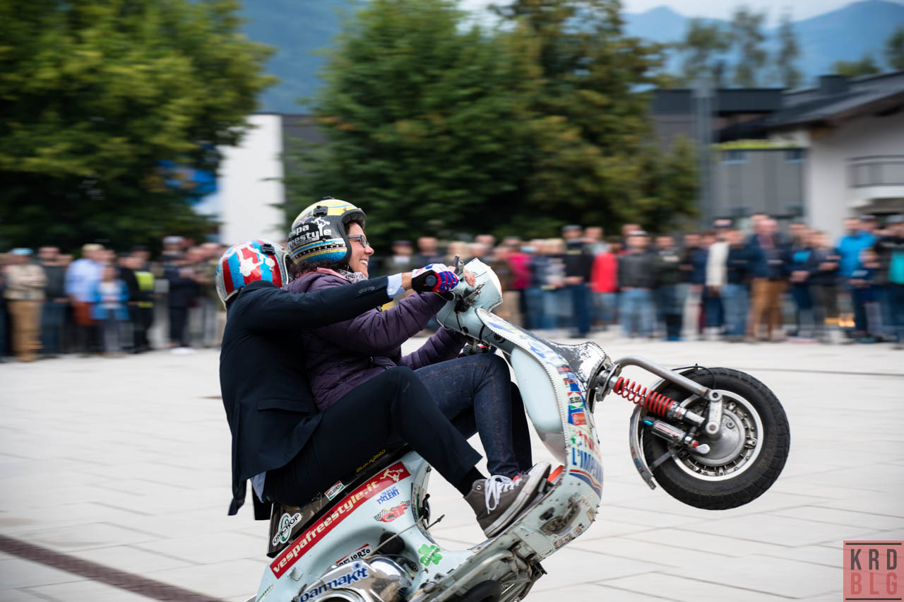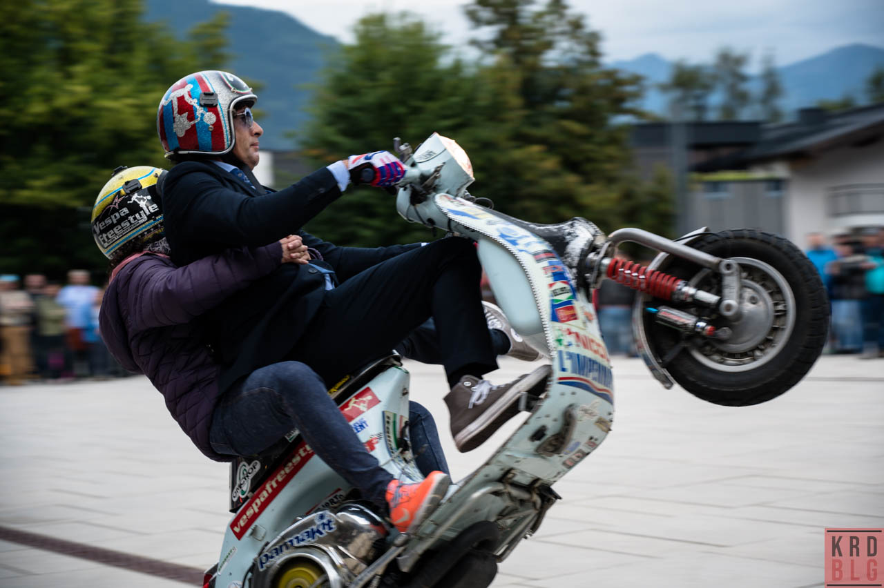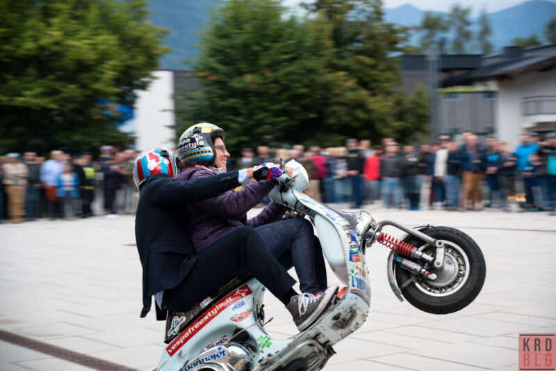 Stuntshow, Party im Congress Center, Verlosung einer Vespa Rallye und Ansprachen runden den Samstag ab, bevor am Sonntag Friedemann Steck (ja, der vom Vespacorso München) DriveThrough Beichten abnimmt und die Rollersegnung vornimmt.
