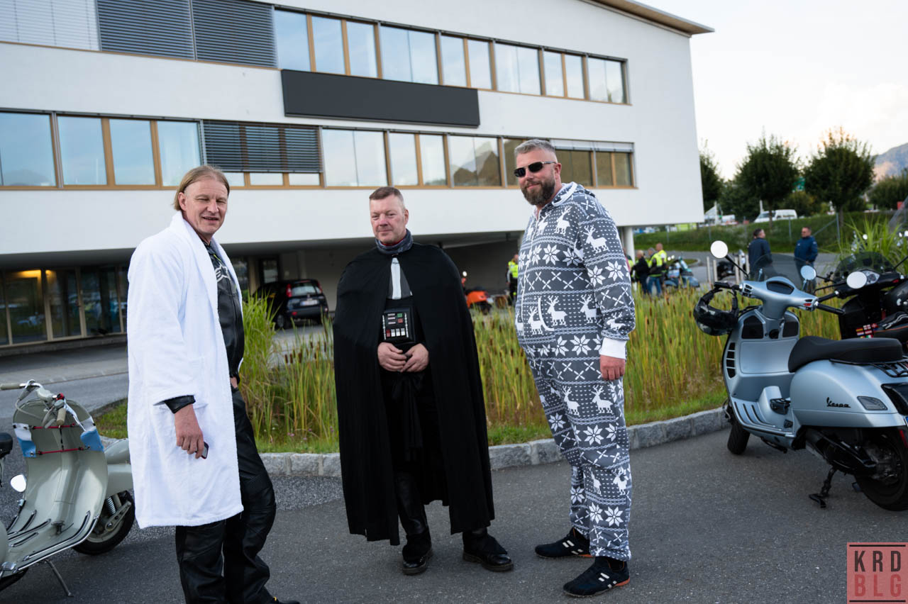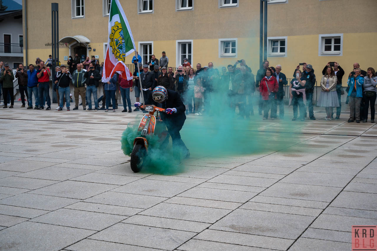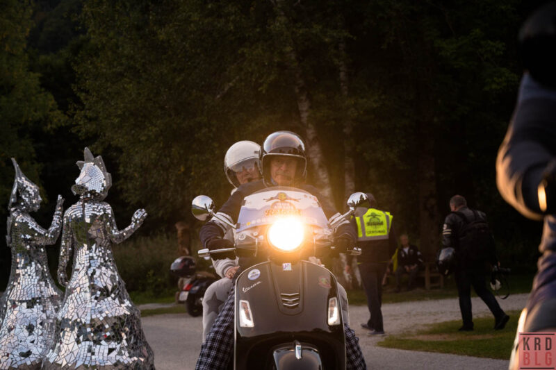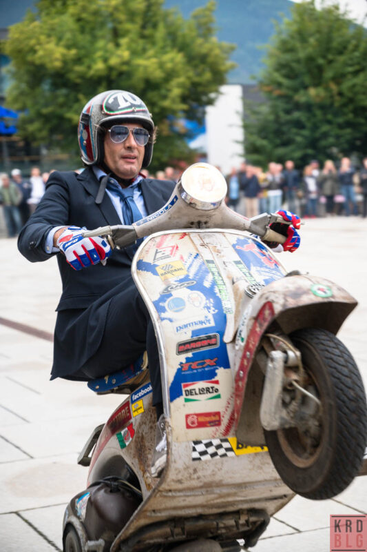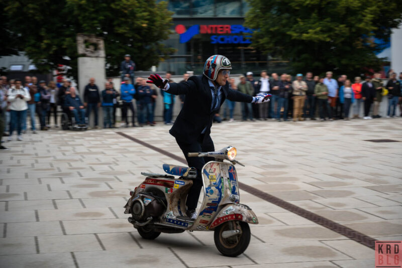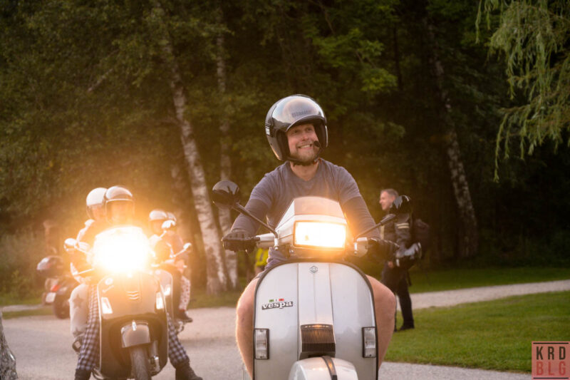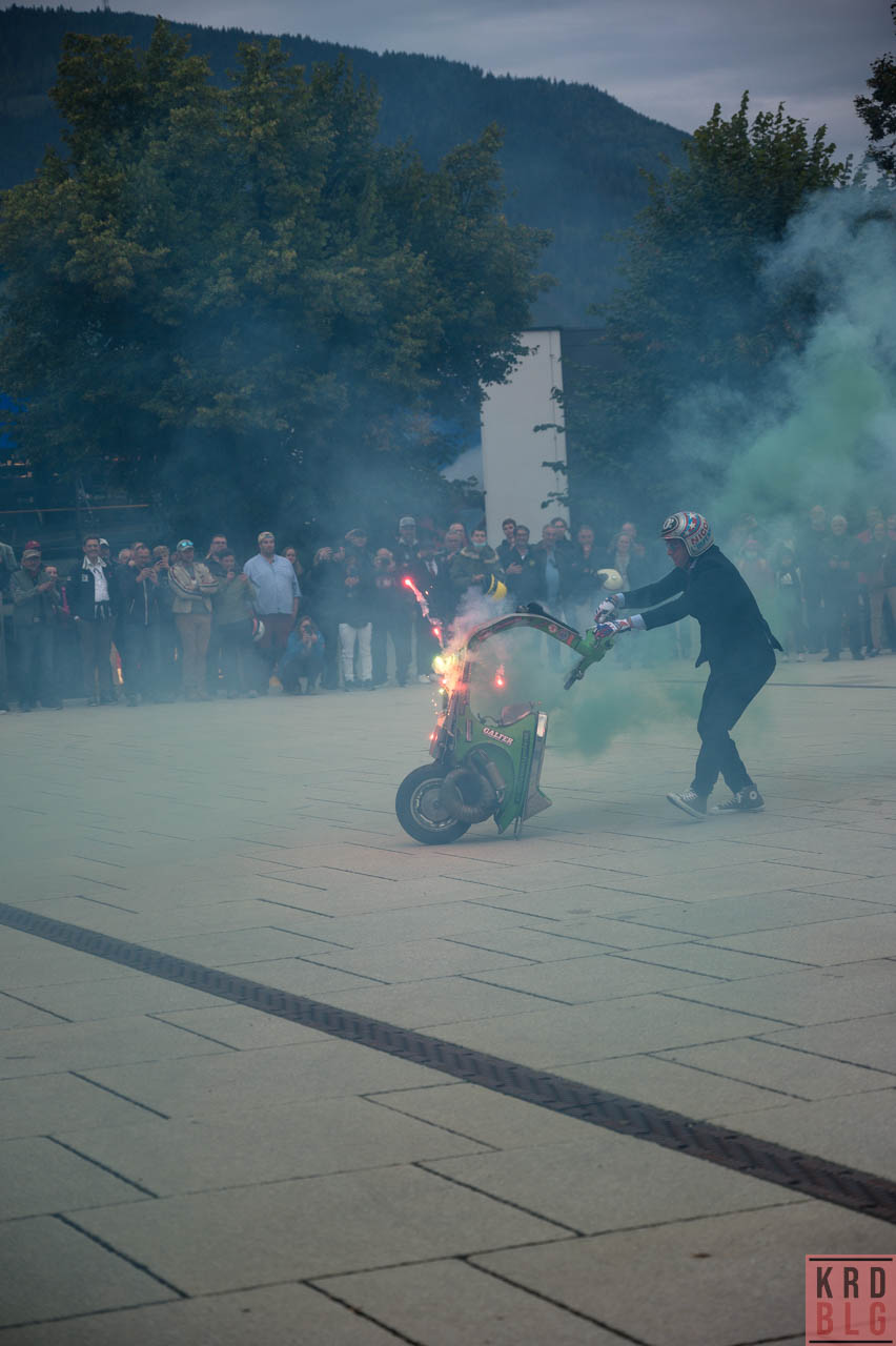 Stuntshow, Party im Congress Center, Verlosung einer Vespa Rallye und Ansprachen runden den Samstag ab, bevor am Sonntag Friedemann Steck (ja, der vom Vespacorso München) DriveThrough Beichten abnimmt und die Rollersegnung vornimmt.