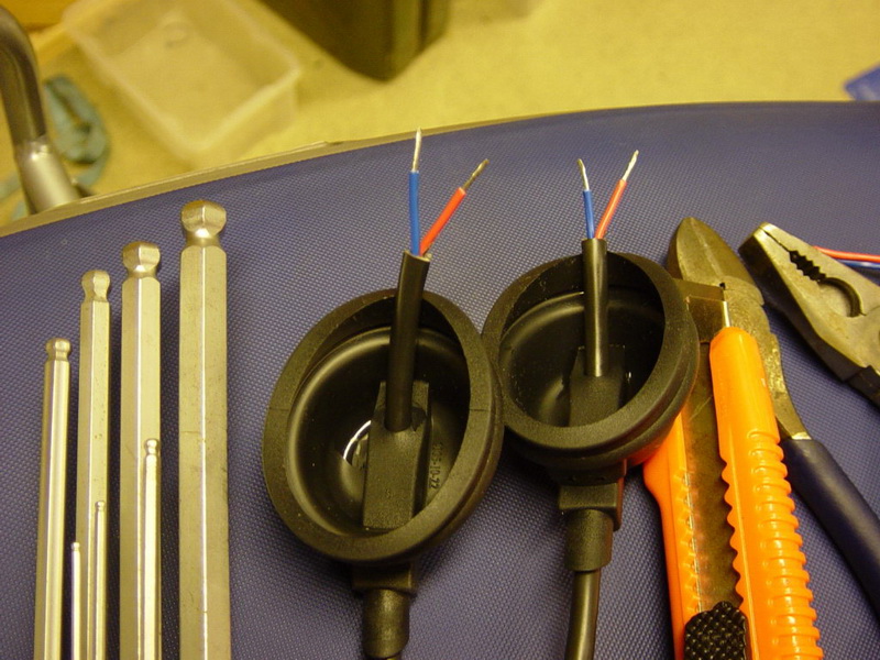 - Nebel 14: Leitung in die Abdeckkappen fuehren ((durch die 2 kleinen Oeffnungen, nicht die Grosse wie auf dem Bild!))