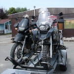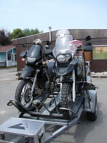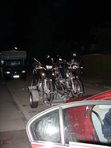 Freitag 25.05.07, 02:30h der scheisswecker plaerrt mich an und ich klettere auf dem bett. nun anziehen, kaffee trinken und runter zum auto. hinter der roten kutsche trohnen die Q und das Kalb seit dem gestrigen tage auf einem anhaenger und starren in die nacht. nun starre auch ich, neben mir heike und im radio bayern 5 mit den nachrichten des tages in die nacht hinaus. 1000 km weiter werden wir die moppeten befreien und weiter reisen.