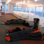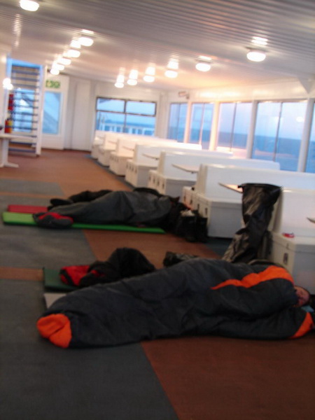 Freitag 25.05.07 23:00h muede … wir sind alle muede, sassen bei der ein oder anderen hopfenkaltschale in der lounge und warteten das hier die lichter ausgehen um direkt hier zu schlafen, jedoch sind diese ideen anderen auch gekomme und den gebuchten pullman sitz koennen die sich mal … den wollen wir halt nicht. wir gehen an deck. am heck ist eine ueberdachte bar, welche zwar geschlossen ist, der platz bietet sich aber an. kaum menschen sind auf dem hinteren deck und man hoert den schiffsdiesel, die wellen, das meer, das ruelpsen von nils und das saegen von e.. wir schlafen dennoch ein paar stunden und irgendwie ist es schon teil des urlaubs.