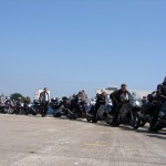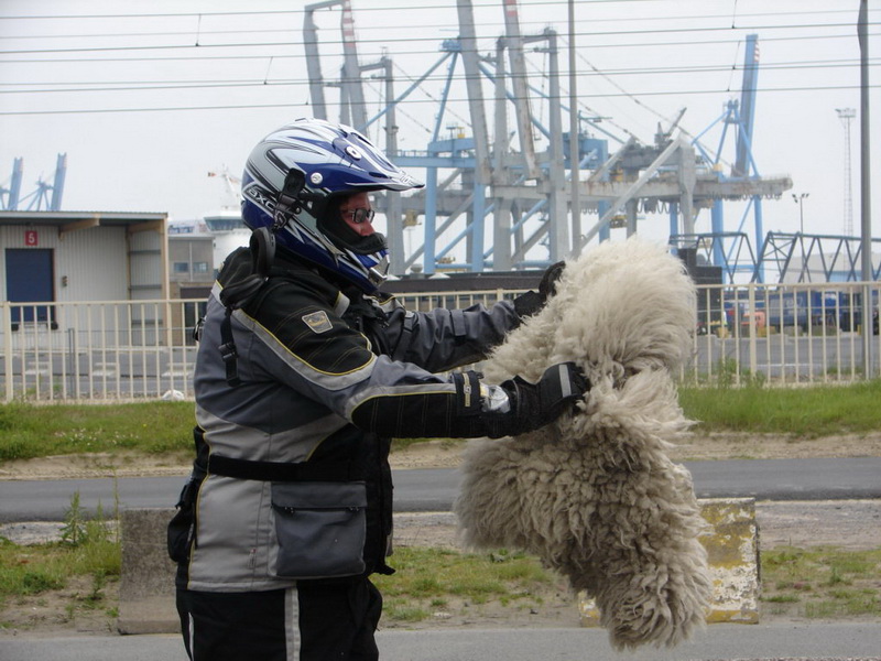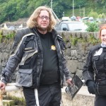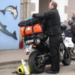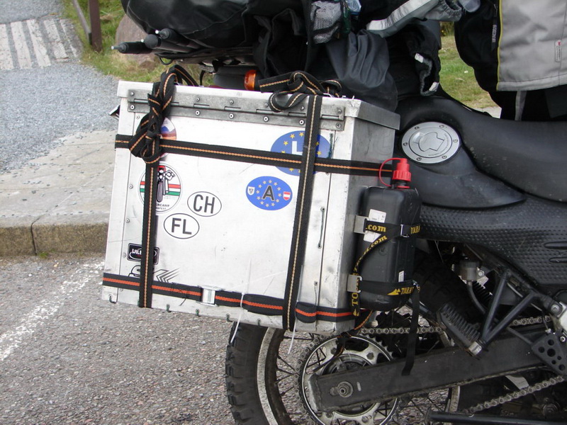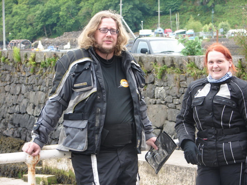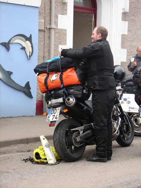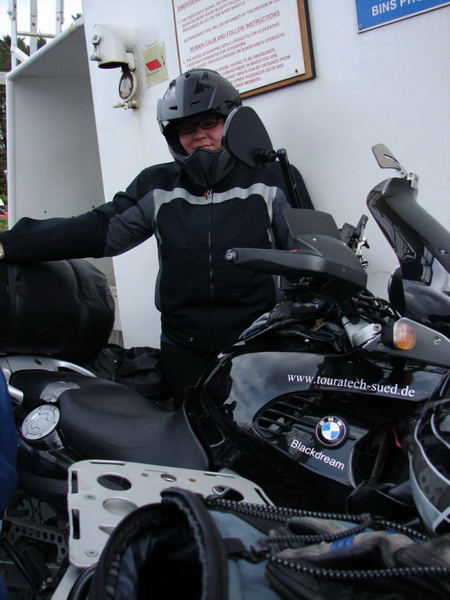 20 km noch bis zum faehrhafen. es ist nun 15:30h wir treffen am hafen auf scotnick (nils), e. (erik) und a-punkt (astrid) aus dortmund. waehrend nilsens schwarze-ratten-f650gs-dakar wie eine echte kleine wanderratte aussieht, mit den koffern und dem packsack, wirken die beiden japanesischen eierfeilen von e. (sprich e-punkt) und a-punkt (wie mans schreibt) wie eine mischung aus dem turmbau zu babel und tetris fuer masochisten. tasche auf tasche auf tasche tuermen sich auf dem soziussitz jedes moppeds so das man es fuer eine riesige und perverse monstroesitaet einer sissybar halten koennte.