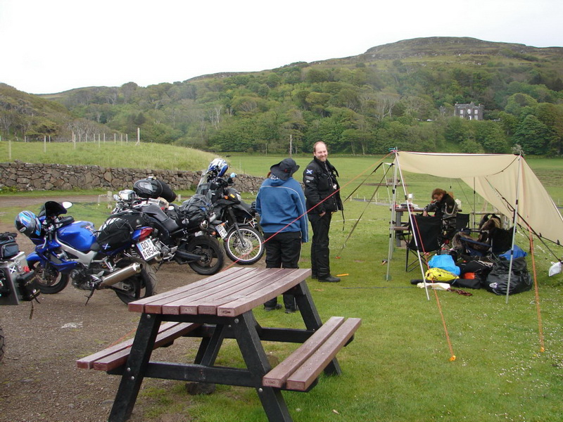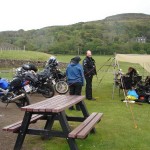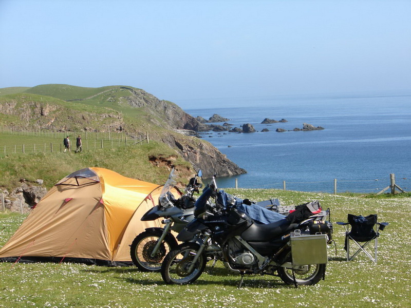 durness. der noerdlichste punkt und 10 meter weiter als unser zelt stand, ist die steilkueste und der atlantik. wind, wellen, keine midgies. wir sind dort 4 tage geblieben, haben viele wundervolle menschen getroffen und viel gelernt. hierher sind heike und ich schon mal vorausgefahren um den midgies zu entfliehen, die anderen 3 sind noch ein wenig im westen der insel unterwegs, wir treffen uns spaeter ja bestimmt wieder. als wir den dritten tag in durness sind, wir haben wie jeden morgen in den excellenten sanitaeren anlagen geduscht und uns kultiviert, kommen eine handvoll neue gaeste auf moppeds angefahren. markus und heike, die macher von schottlandfieber.de sind angekommen und berichten, das unsere restliche truppe wohl im laufe des abends ankommen wird. wir freuen uns maechtig auf die drei. am naechsten morgen schnappe ich mir heike und a-punkt und wir fahren los um ein long way down memorial picture zu machen nach john o groats.