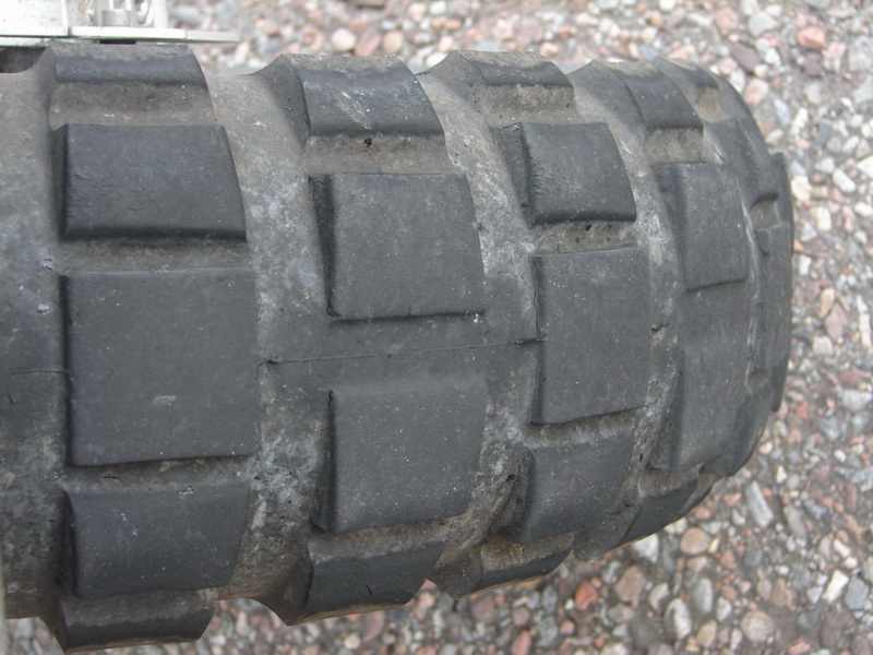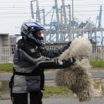 kurz bevor der kreisverkehr richtung bruegge kommt, bremst nils abrupt ab, faehrt rechts ran und spurtet ueber die strasse. auf einem der betonpoller liegt ein grau-schwarzer lappen. das ehemals fast weisse schafffell ist tatsaechlich wieder aufgetaucht, in dieselruss und regen harrte es ueber 2 wochen aus und nils steht fast eine traene im auge als er das fell ueber seine sitzbank wirft, das fell verzurrt und wir weiter richtung campingplatz fahren.
