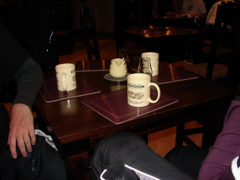 pitlochry. nach der whiskyverkostung bei glenmorangie und dem nils sich seiner selbst abgefuellten fassstaerke eines uralten troepfchens mit dem obligaten einrag ins buch der selberabfueller der destille treffen wir in pitlochry ein. hier bleiben wir 2 tage um zum einen die rannoch station, den zweiteinsamsten bahnhof zu sehen und zum anderen um bei edradour eine whiskyprobe und eine fuehrung zu machen. endradour ist die kleinste legale destille in schottland. irgendwas mit der hoehe der destillierkolben oder so, sonst irgendwie nicht legal … egal. lecker wars halt. und ne tasse von edradour habe ich nun auch. in pitlochry habe ich mir mein mega souvenir gekauft, einen kilt in blau mit dem weissen andreaskreuz. naja, wer es tragen kann, sage ich da nur. hier trennen wir uns abermals von der truppe und fahren nach dundee.